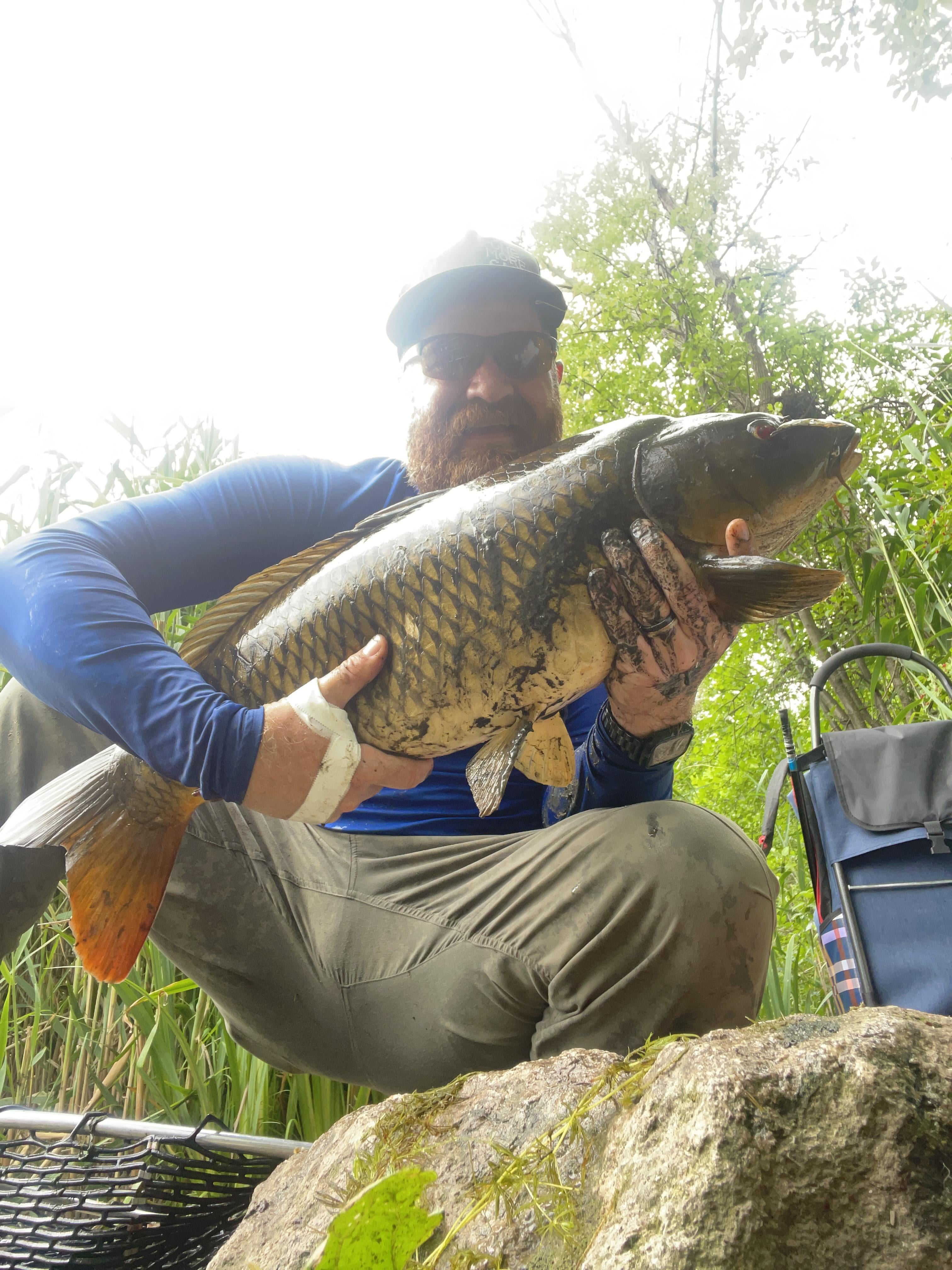 đ¨đŚ 17lb 8oz common. Been at it for weeks now, haunting my local pond. Got him on a hair rig with corn and my homemade pack bait.