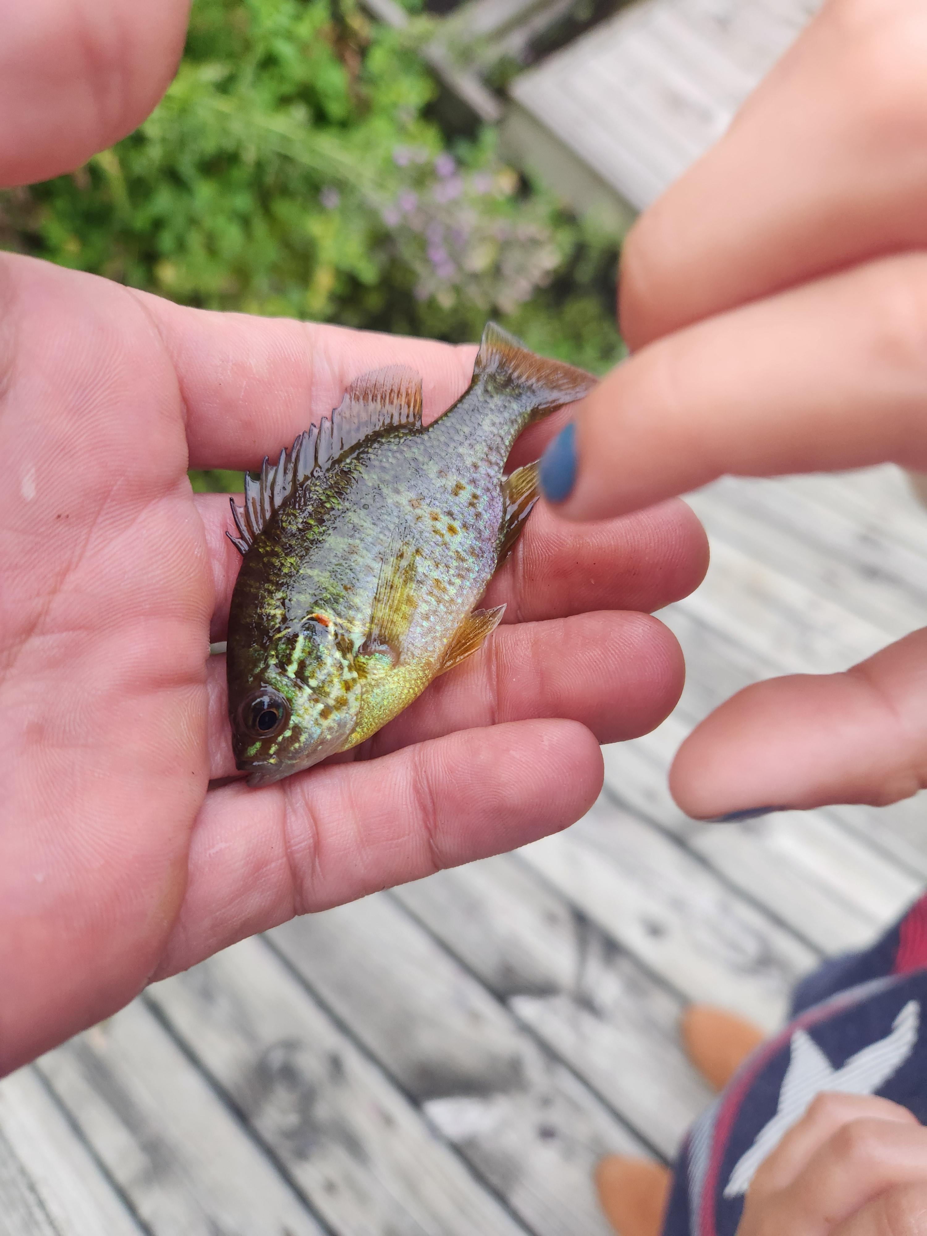 There were some big carp and bass, as well as some large bluegill in the middle that I could see. But it was much more fun to just catch the little bluegill, redear, and pumpkinseed right at the dock. No reeling needed, just 3 feet of line, a tiny hook, and a worm. Caught maybe 40 fish ranging from 1 to 4 inches. It was exciting for my kids (4 and 5 years old) and I didn't need to worry about them snagging me or each other with a cast.