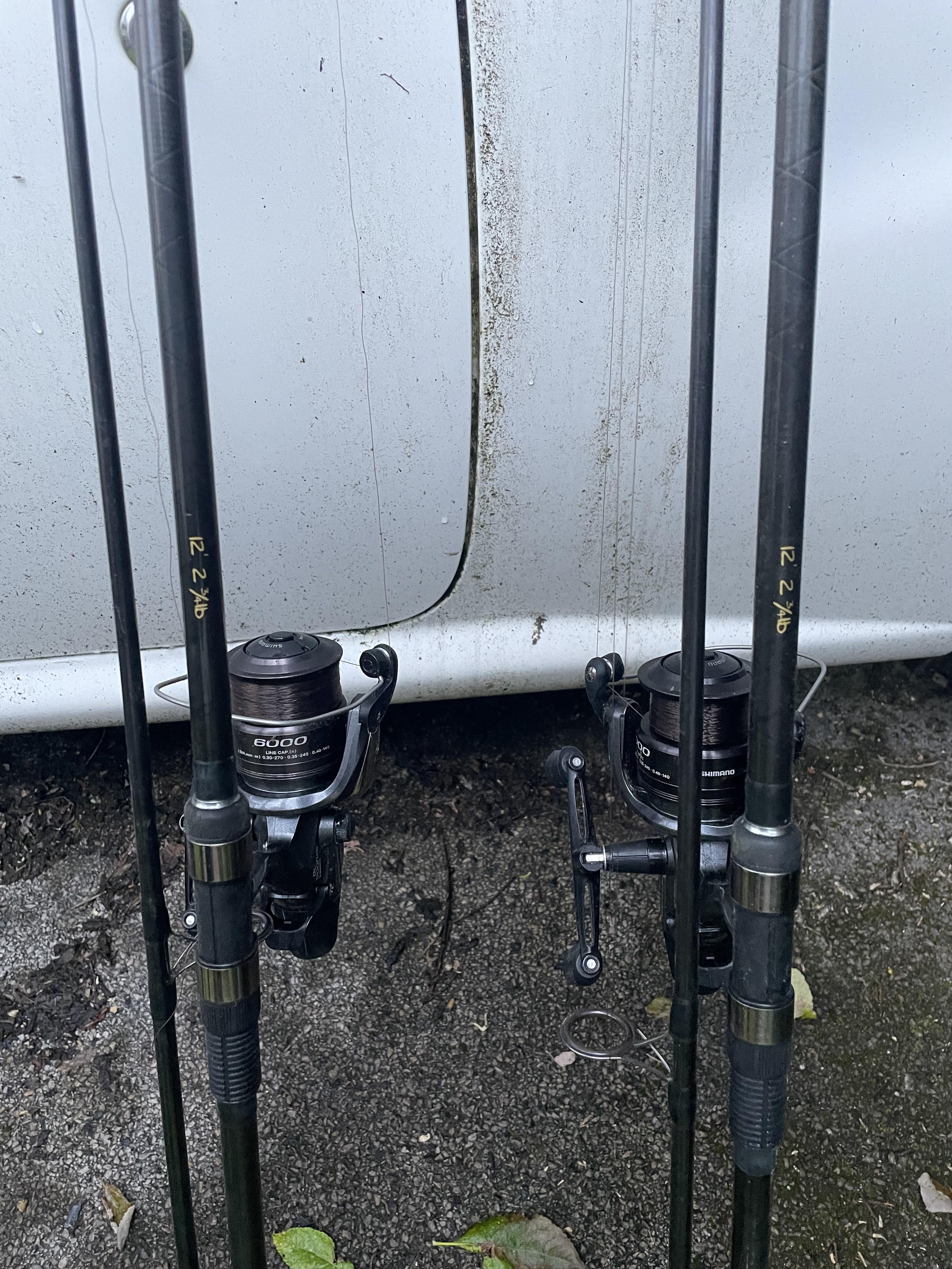 To me I’m guessing they might be shimano rods?! The writing markings are very similar to the old tribal logo from early 2000s before they made it all thicker! But that’s a very loose guess! Check the butt and the reel seating for any markings to look up. Failing that I would have thought a company like shimano and all the bigger ones would have put a marking on them so I would have thought that they are marked up. If not they could be bespoke or a later market third party rod. The cross wrap carbon was popular with people like darent valley in late 90s/2000s but then later around 2005 lots of Chinese imports like badger international and dragon carp started making them like this too before going into that carbon fibre look