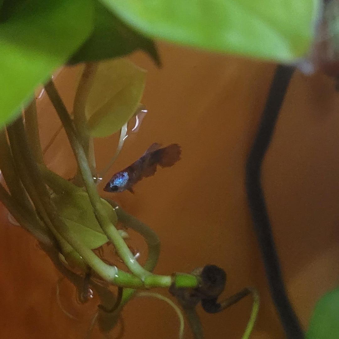 Today my friend reached out to me saying they knew of a betta that was being neglected and needed a new home. Her fins are torn, and I think she's been malnourished because she's almost a year old and so, so tiny. She may have a minor deformity in her spine as well, she swims just fine but her body sits at an odd angle when she's resting.