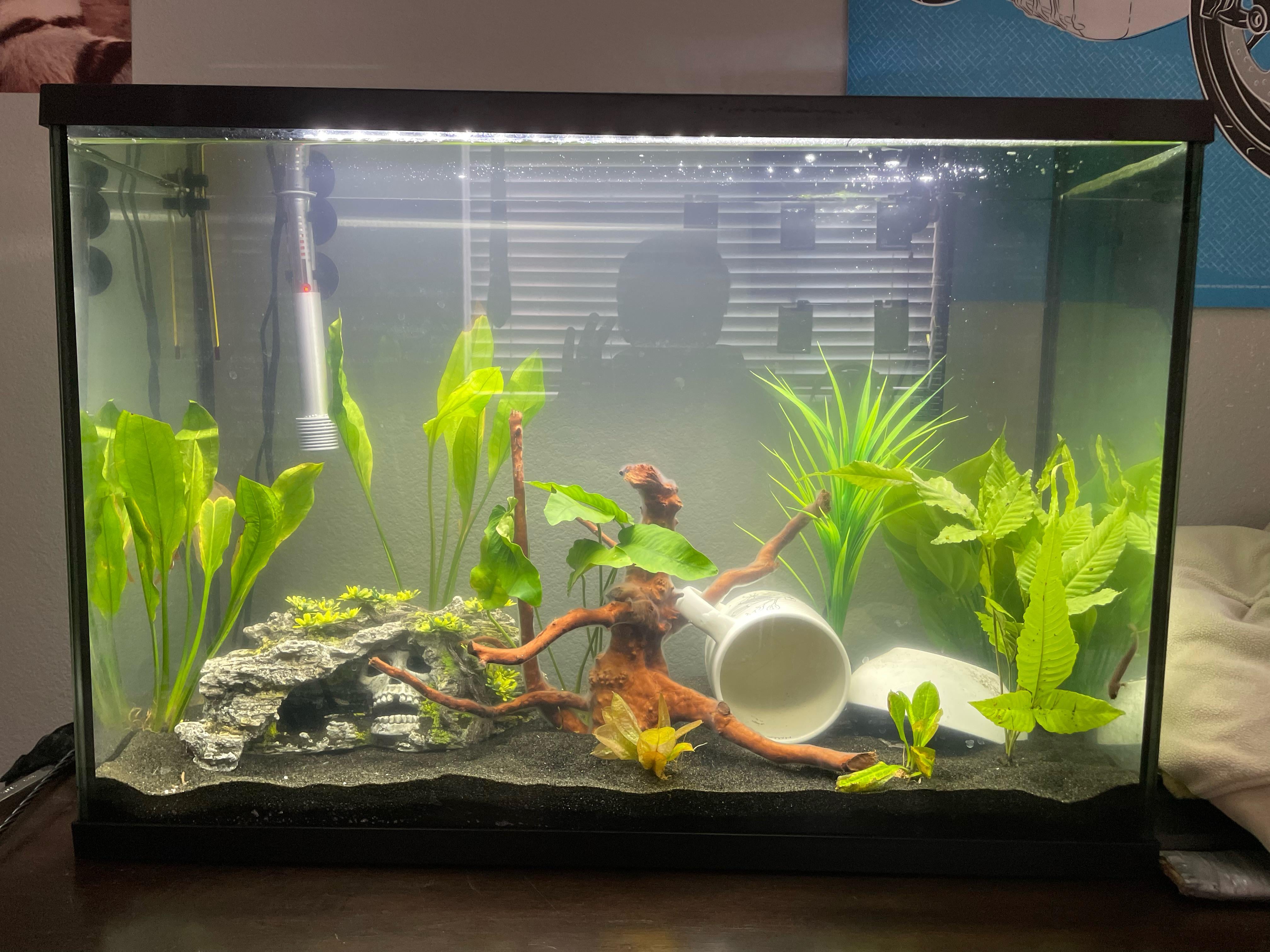 30 gallon grow out setup for bgk, rainbow shark, and a bicher. note that they are all like 2 inches long and will be moved to a larger tank once they grow. (coffee mug is temporary for waterlogging the wood) Posted by Mean_Leek223