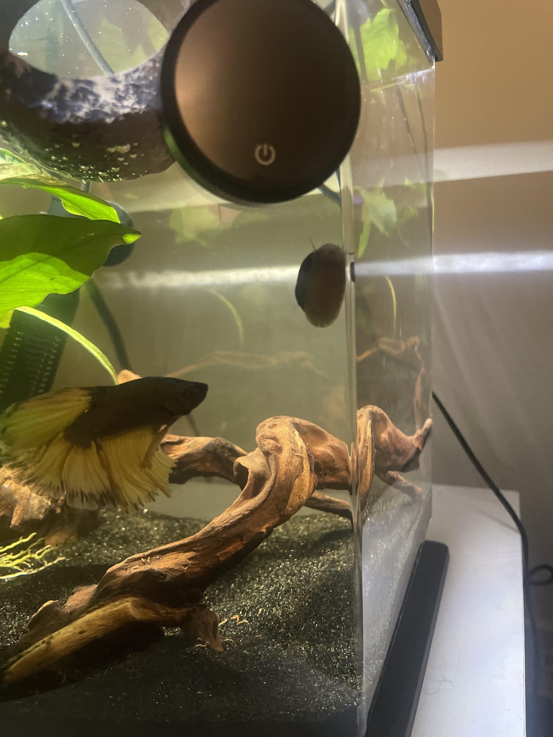 I have a betta tank with one nerite snail, will he be fine a few days without any supplemental food? Anything I can do in a pinch? 🤦♀️ Guilty dog pic, plus betta and poor snail buddy 😆