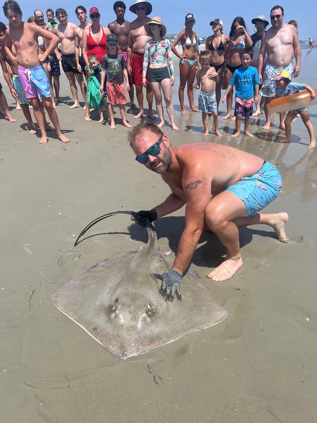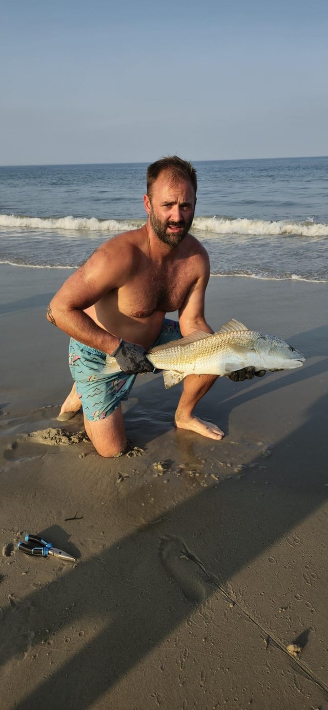 Never really had much luck fishing in such shallow surf. Starting catching a ton of croaker/spot almost nonstop, then I started wading/swimming out to the sandbar and casting from there. Nothing crazy but the little red was nice, and it was a nice crowd watching me catch that nice southern ray. Not very big but an aggressive, short 10-minute fight.