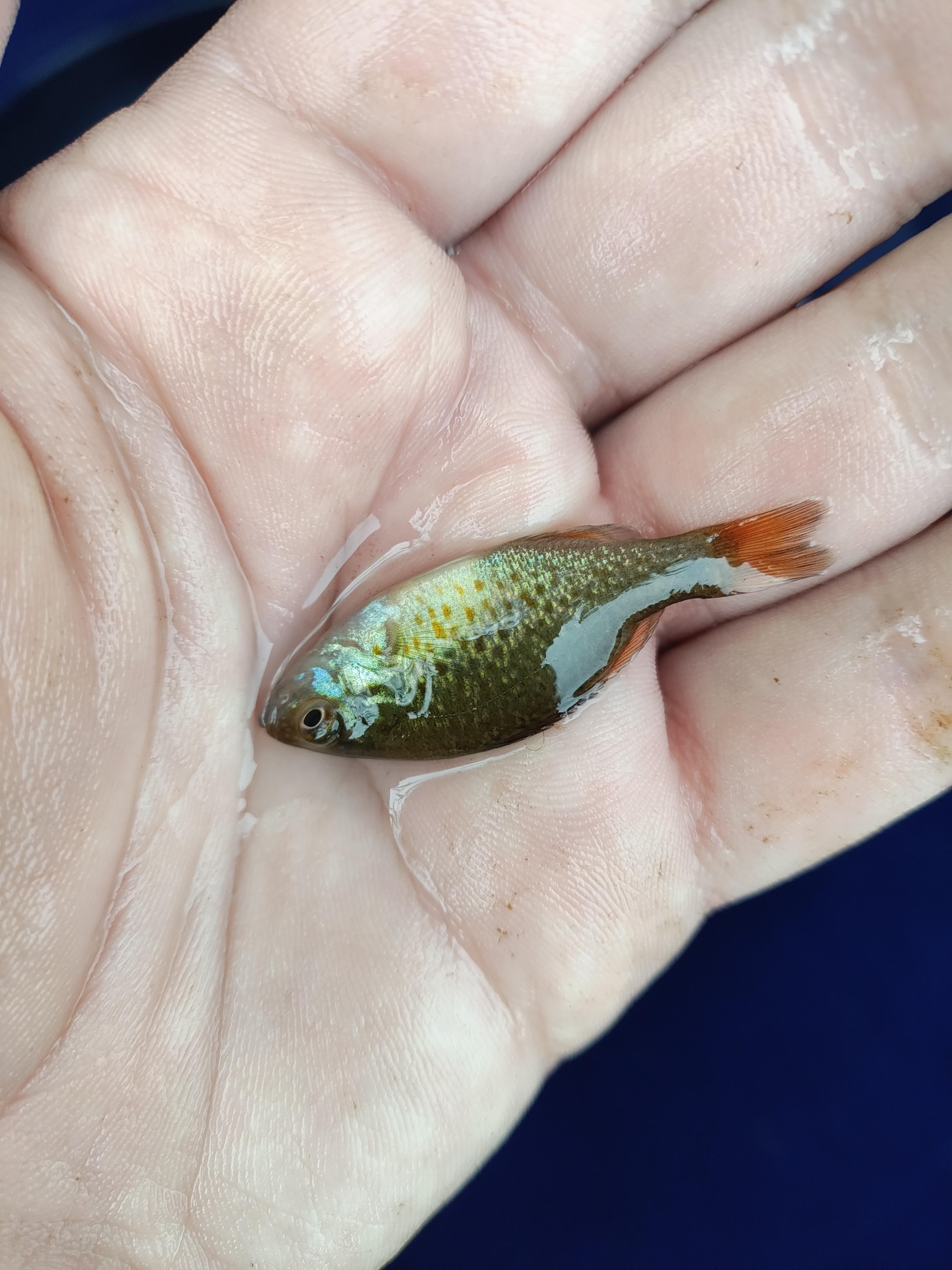 lipsquirrel on August 9, 2024 12:02 am Juveniles are a little tougher to distinguish, but my best guess would be a Pumpkinseed. Definitely a Lepomis (sunfish genus) of some type.