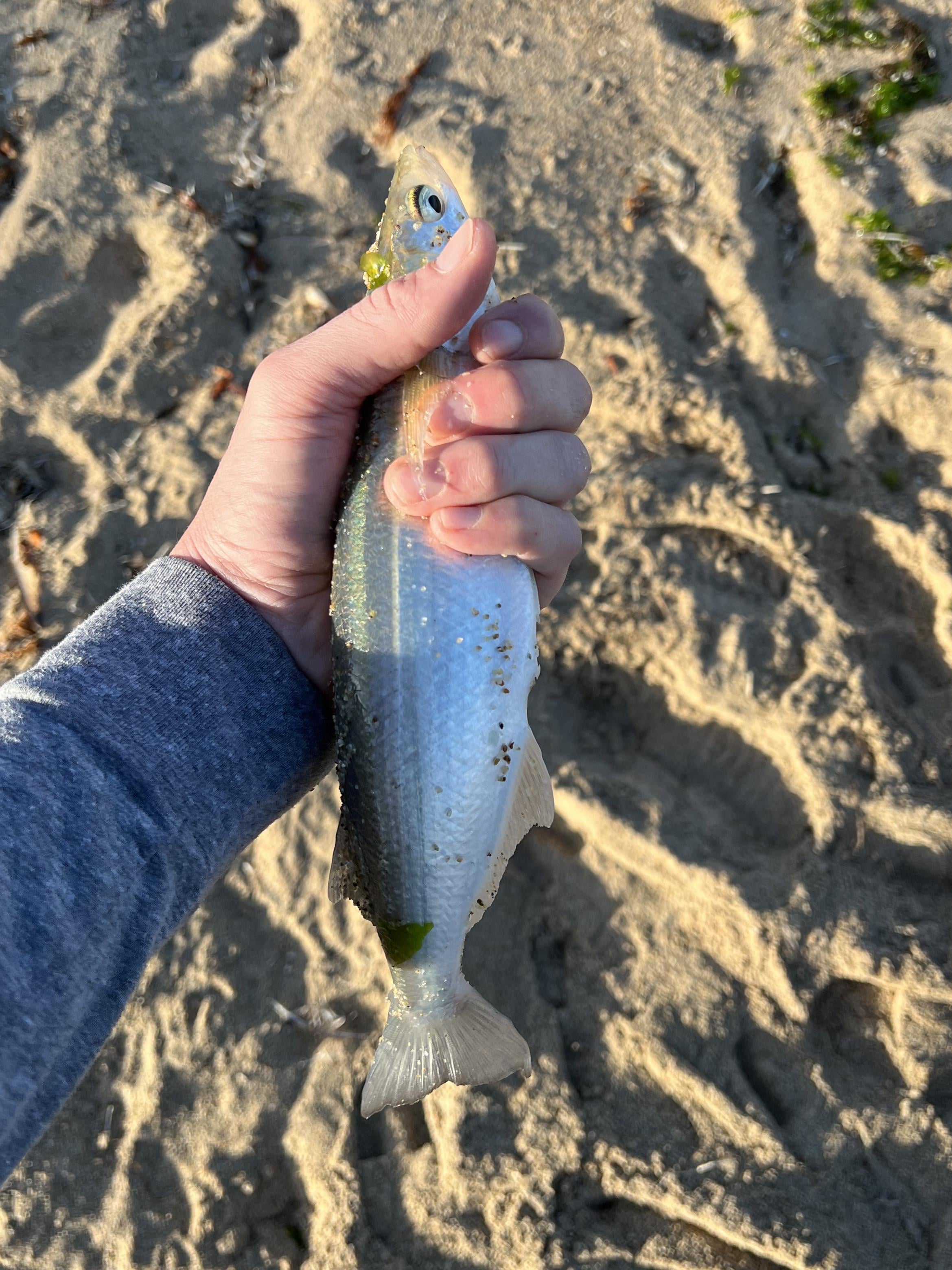 I agree with the above comment. it looks like a jack smelt. If you keep the smelt, either use it for cut bait. Maybe there in the surf or take em home and try it for catfish.