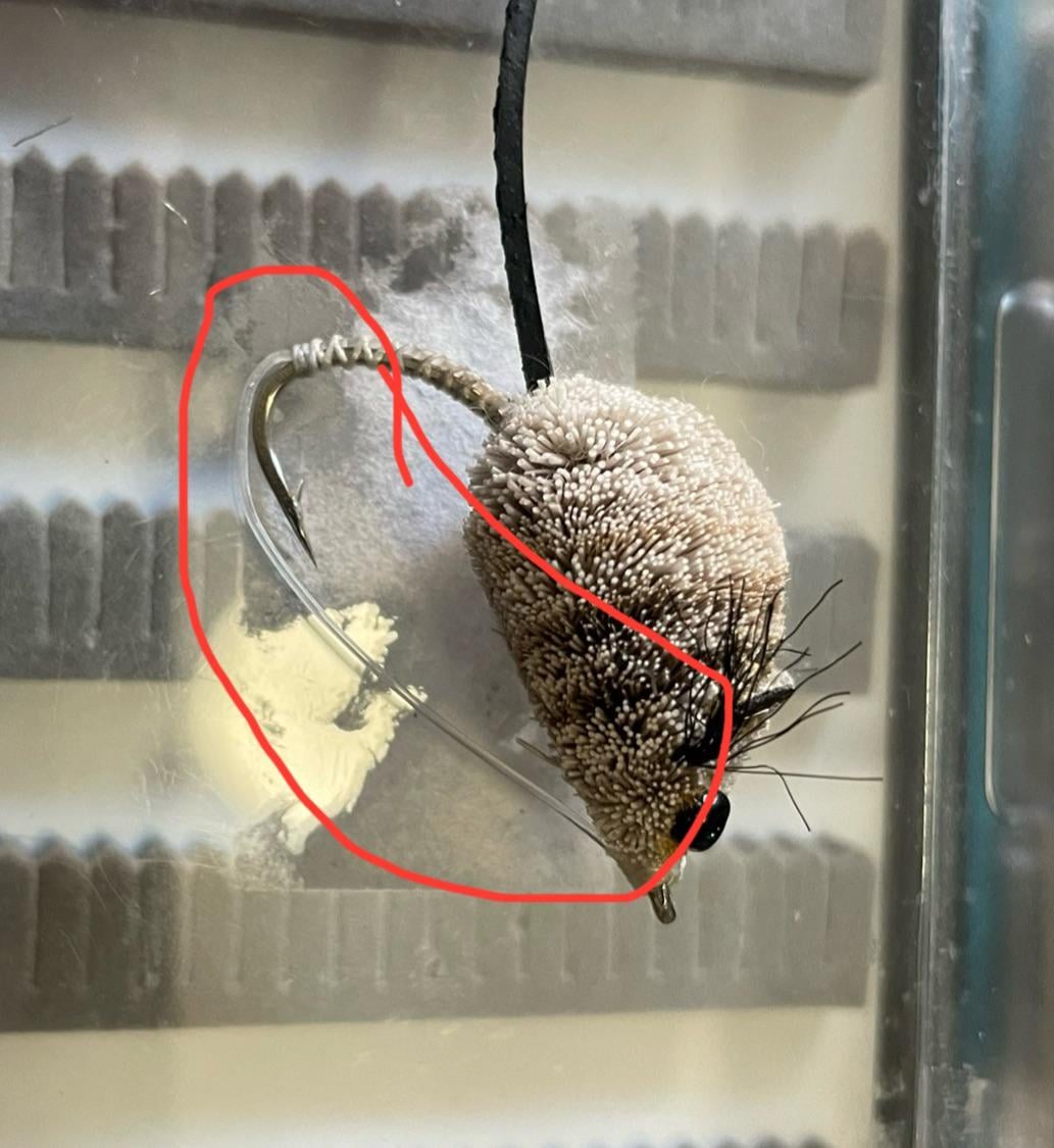 I bought a size 8 mouse fly to try on some bass, and it has a strange string between the eye and the hook (circled in red).