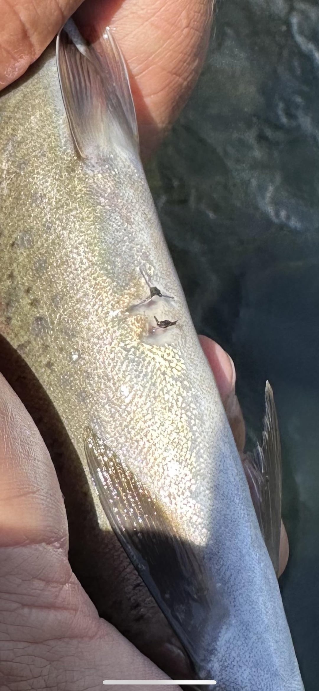 That fish likely had an internal monitoring tag of some sort. If it was large enough to require two incisions like that, it’s likely to monitor fish movement or biological data depending on what fisheries biologists are trying to study in that fish population. Often their presence can be picked up when a fish moves past a sensor in a lake or river.