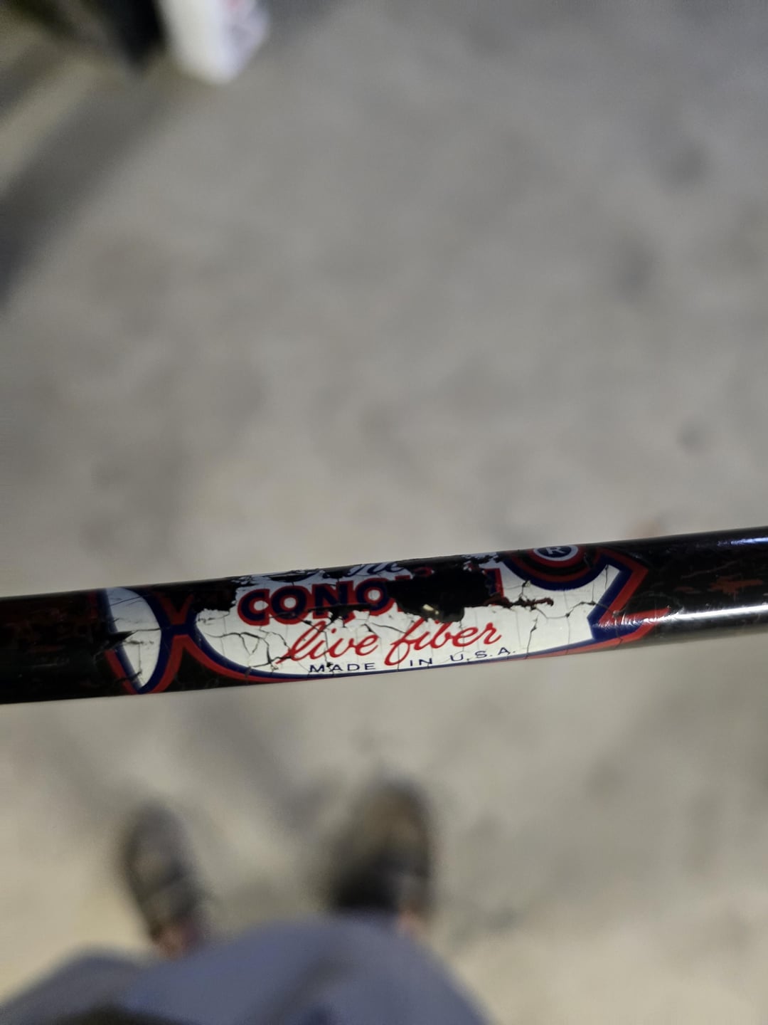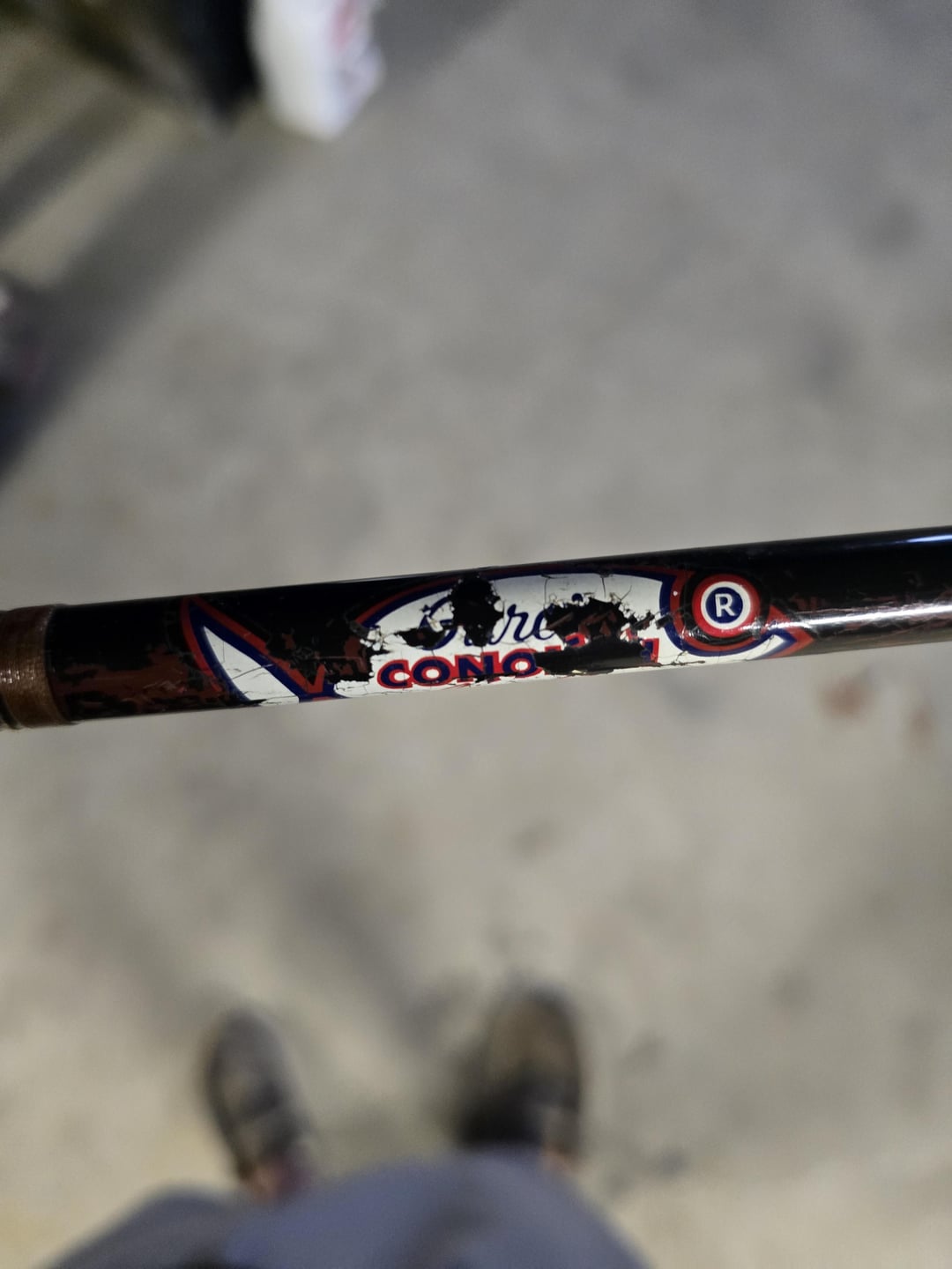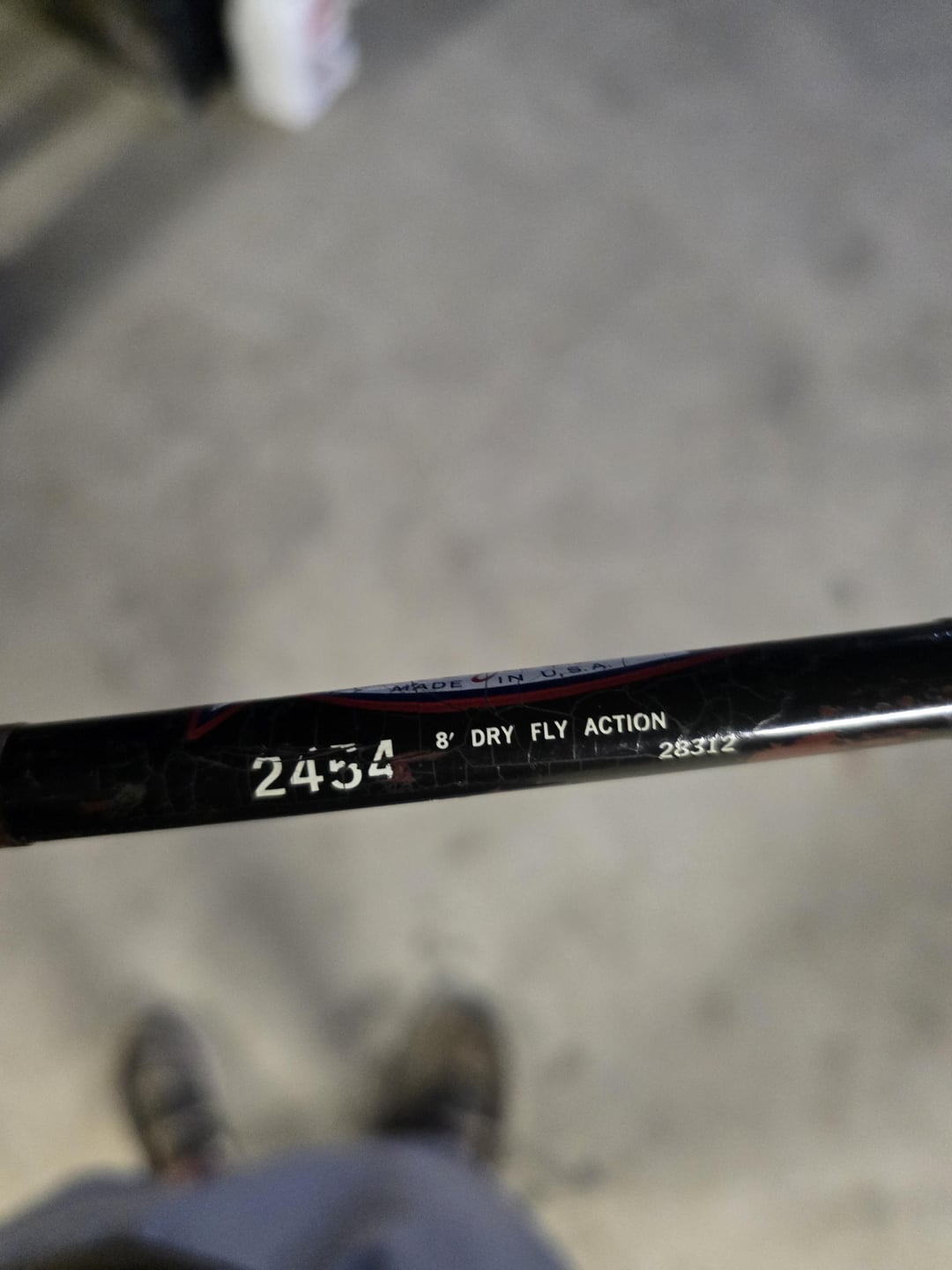 Looks like a Garcia Conolon. I don’t know anything about it but a quick google looks like it’s well regarded in the fiberglass rod world. 8 foot, model is 2454. Dunno if that other number is the serial but that may tell you more.