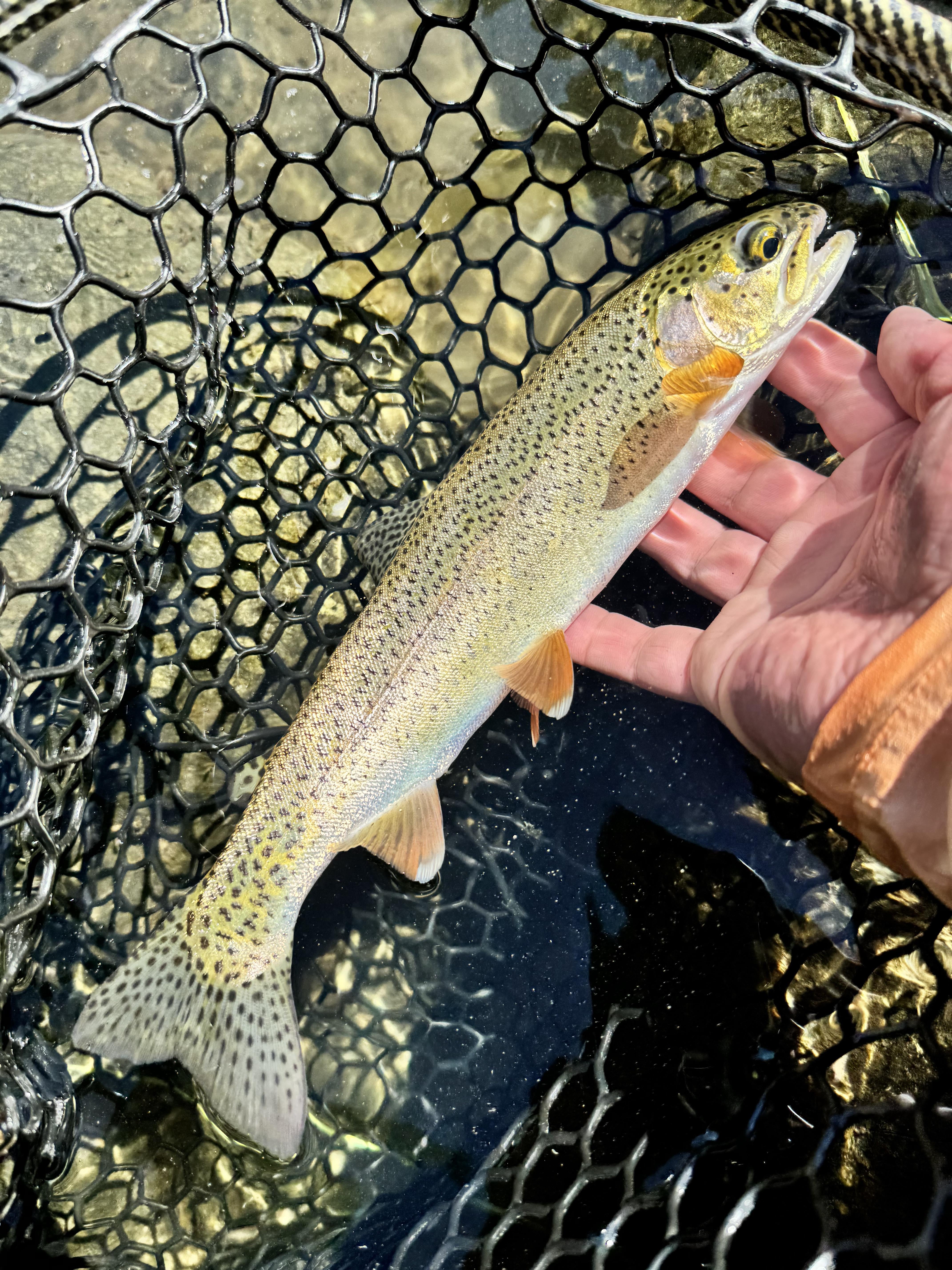 Love the white tipped fins on the rainbows out here. Caught on a dry dropper with a size 10 stimulator on top and a size 18 caddis pupa on the bottom. (It ate the caddis.) Posted by tommykimchi