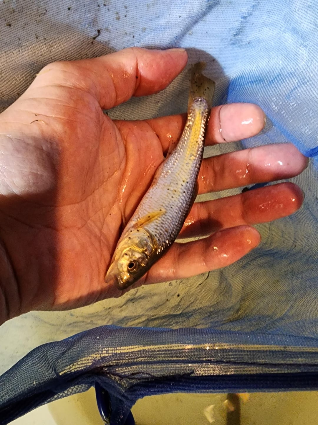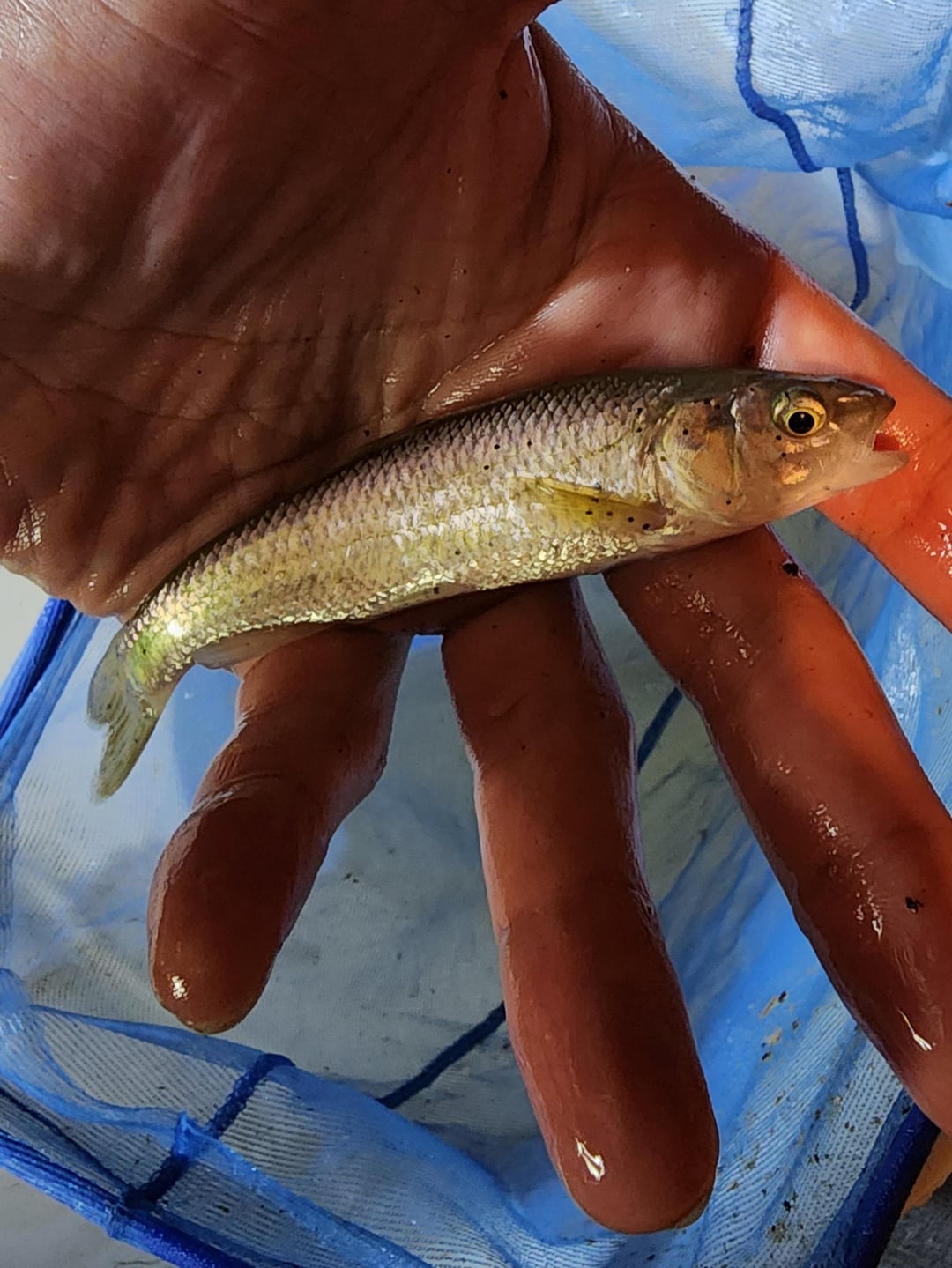 Caught a bunch of these in the creek behind my house along with the parent species as well. They look very similar to juvenile fallfish at a glance as they have that bright bluish silver reflective colour when pulled from the water.