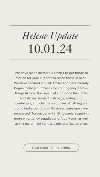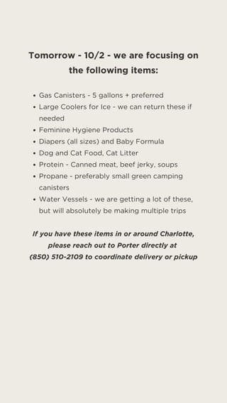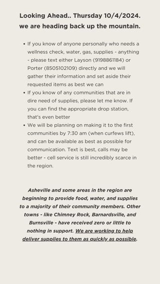 I am currently in Charlotte, NC with a team gathering donations and purchasing supplies to run to areas around Asheville that have not received support/water/supplies yet.