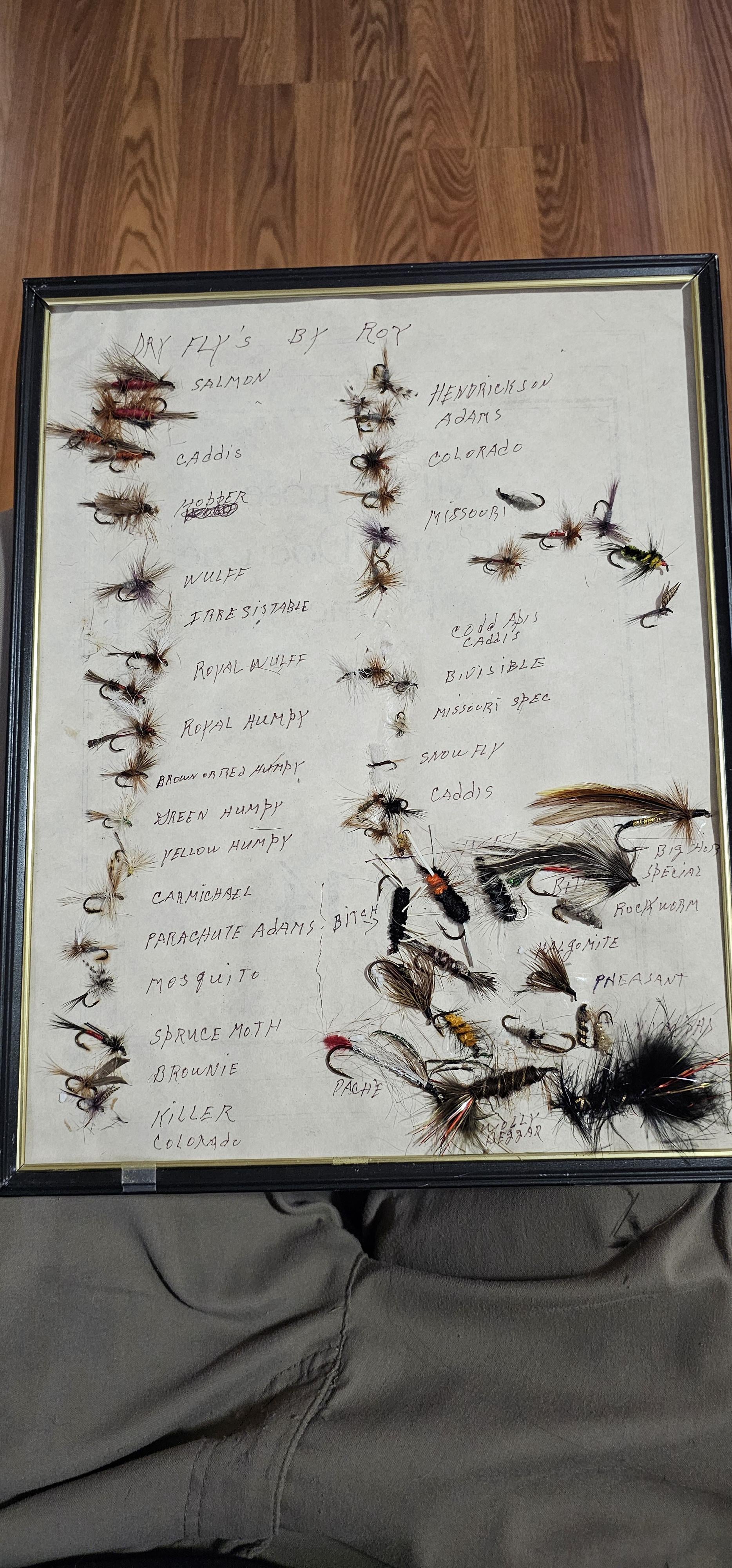 My dad sent this to me from an old Veterans Grace home that used to do flyfishing. The flies on the top right are out of place, if anyone can ID these that would be a huge help. As for time line of these flies, I have no idea. They could be 20 to 100 years old as far as I know. Thougt I'd share it here and let's other see this beautiful piece of art.