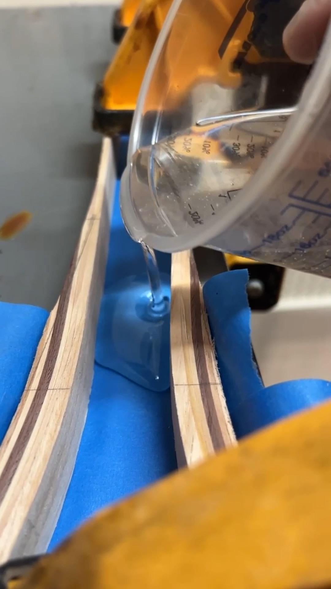 Nice work. I almost was going to ask if you had a router table and just routed that whole thing out until I got to the pic of you pouring to see the layers. So this one you stained after to match the walnut? Walnut’s usually pretty splintery, were you able to bend it around the forms? What were your layers? My friend makes them and I might try this winter.