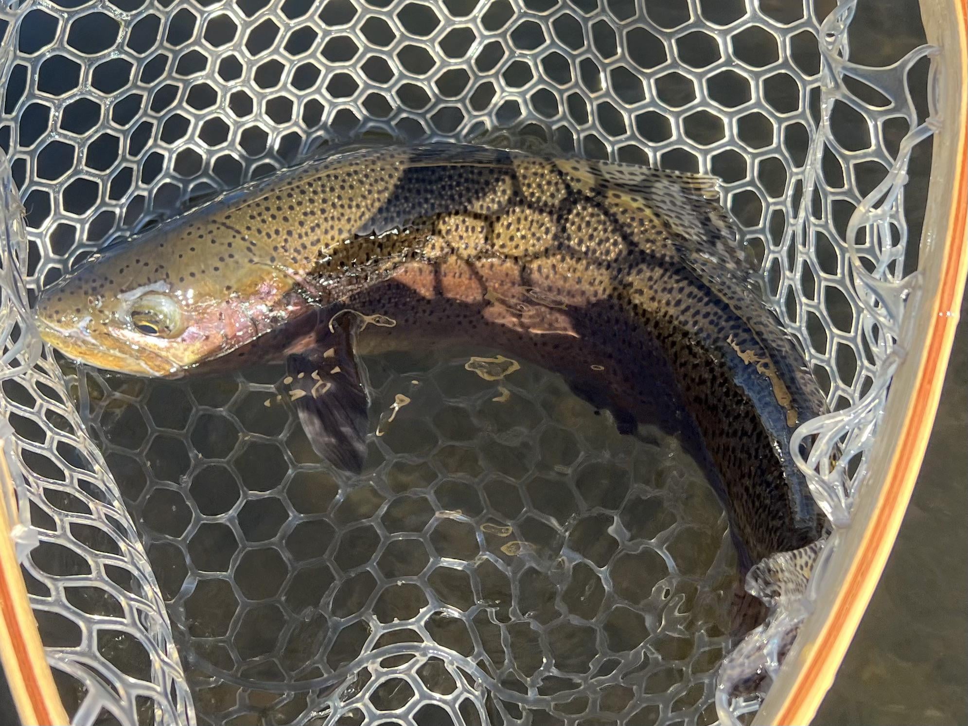 Spent almost two hours in a familiar spot, working every possible fly during a solid hatch. Finally switched up to a 24 PMD, and was rewarded for my perseverance. Beautiful fall rainbow on a Northern California tail water.
