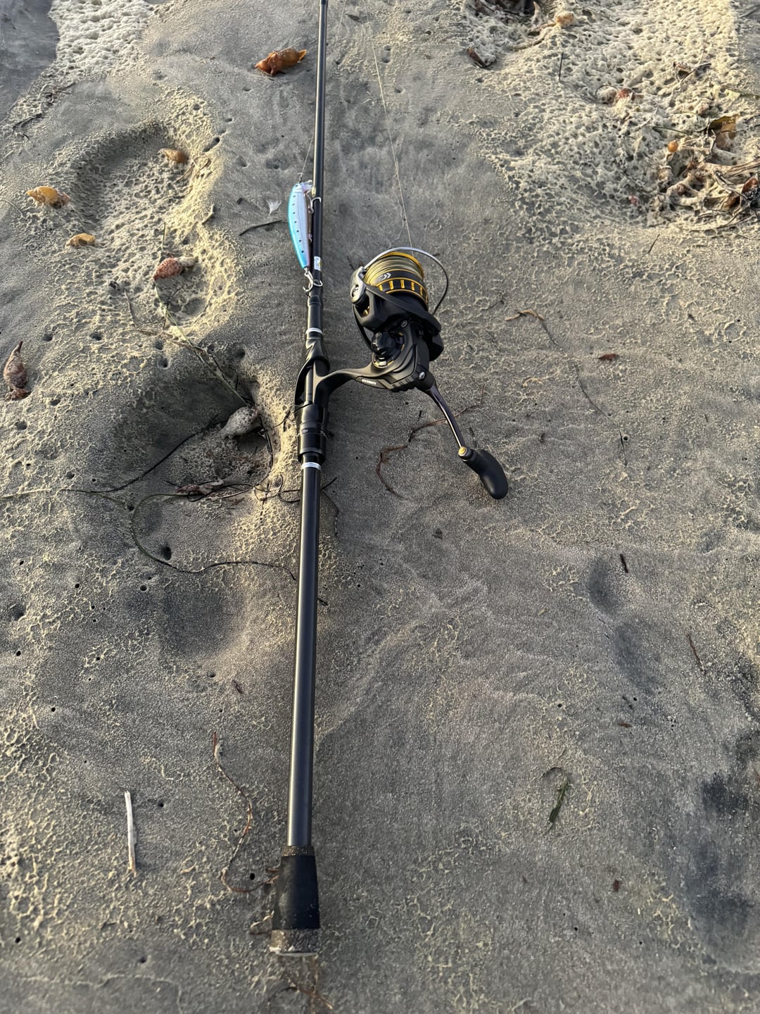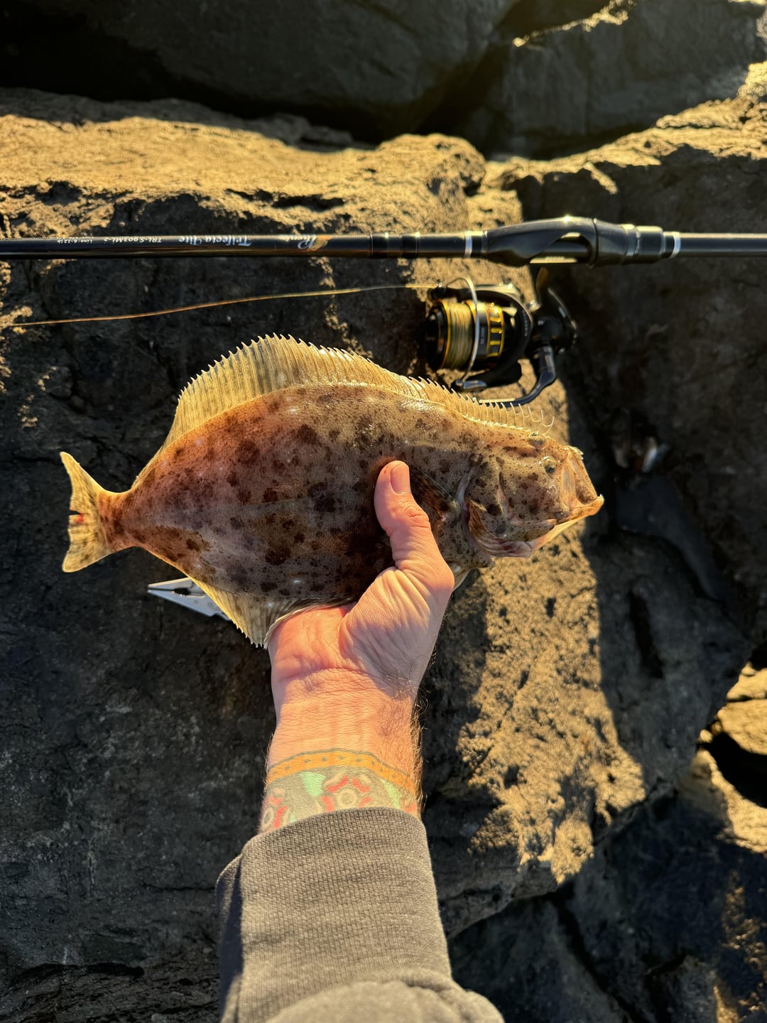 Metalic sardine lucky craft. That’s a halibut 😉 Perfect kick stand pose with the reel handle as well.