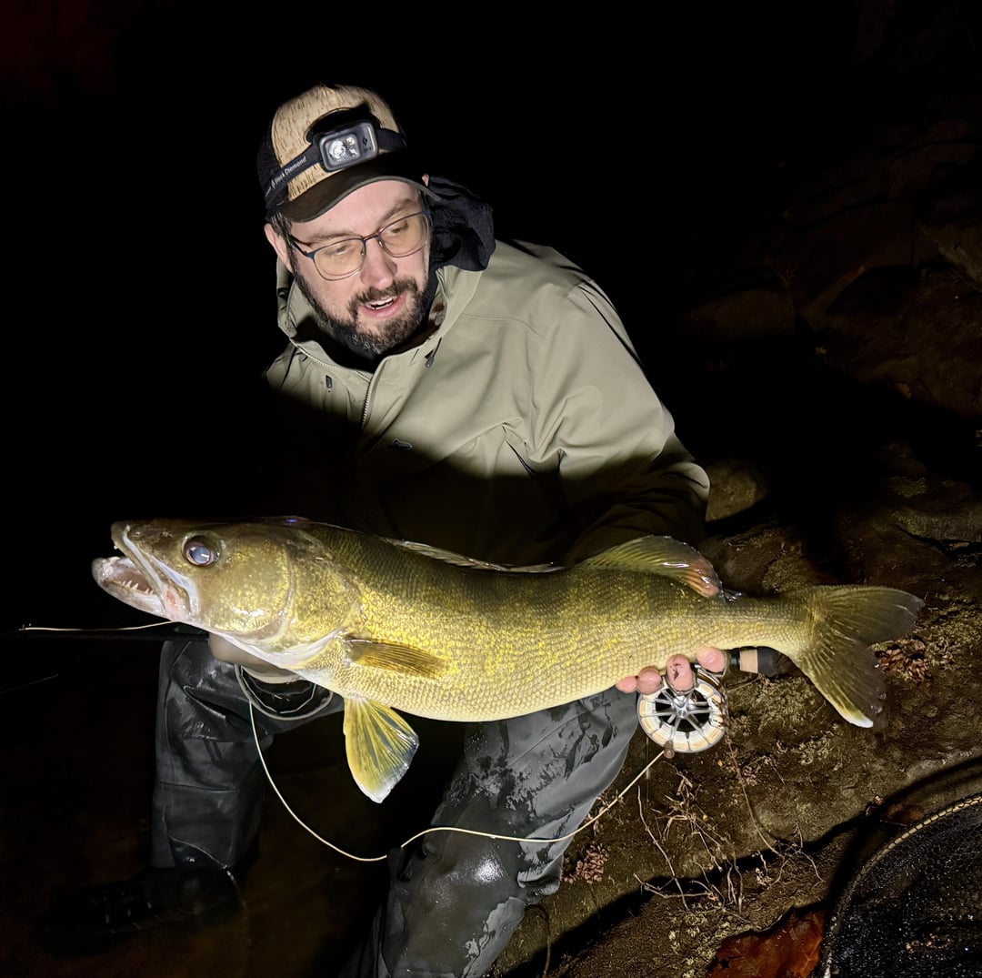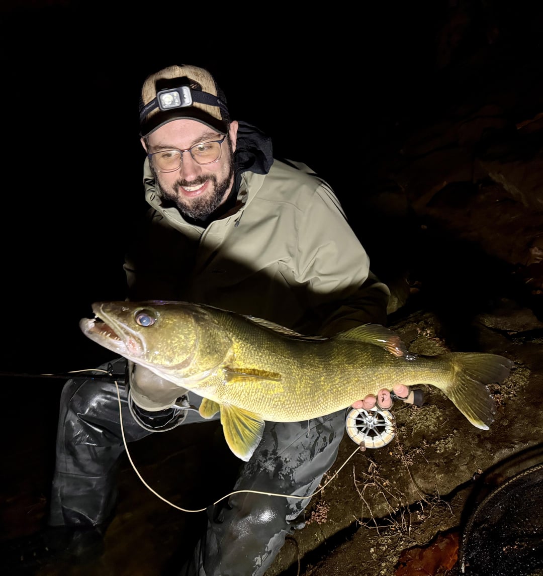 I’ve been heading to the big rivers and doing some night wading with a friend who fishes these warm water rivers with spinning gear for bass and walleye. This time of year when the weather gets cold the walleye are usually pretty active. I took an 8 weight with a short leader and a floating line, and slow worked small baitfish flies through the drop offs and seams. This was the biggest of the night – 28” and 7 pounds. Lots of 14-18” fish in the mix. My friend was fishing swim baits and husky jerks, and my streamers were out fishing him 2 – 1.