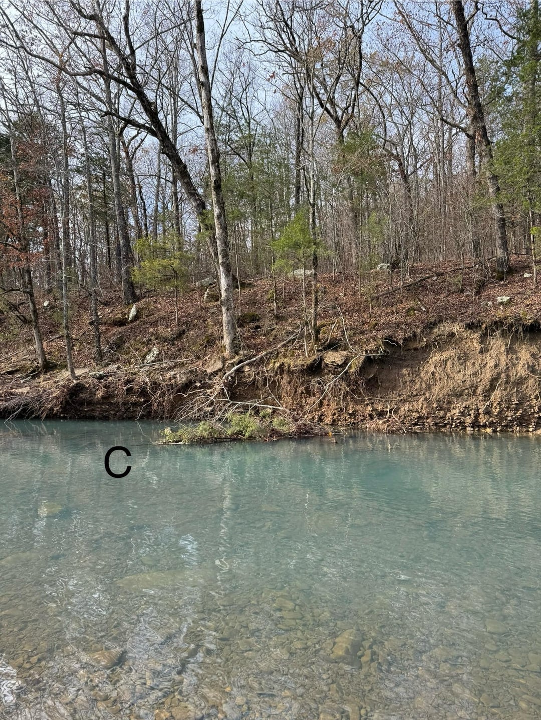 I move on down to structure of picture C. Nothing. Not even bluegill bites off the opposite bank. I start looking around to see if I can see fish, but I don’t even see feeder fish. In picture D you can see the downriver chokehold I mentioned.
