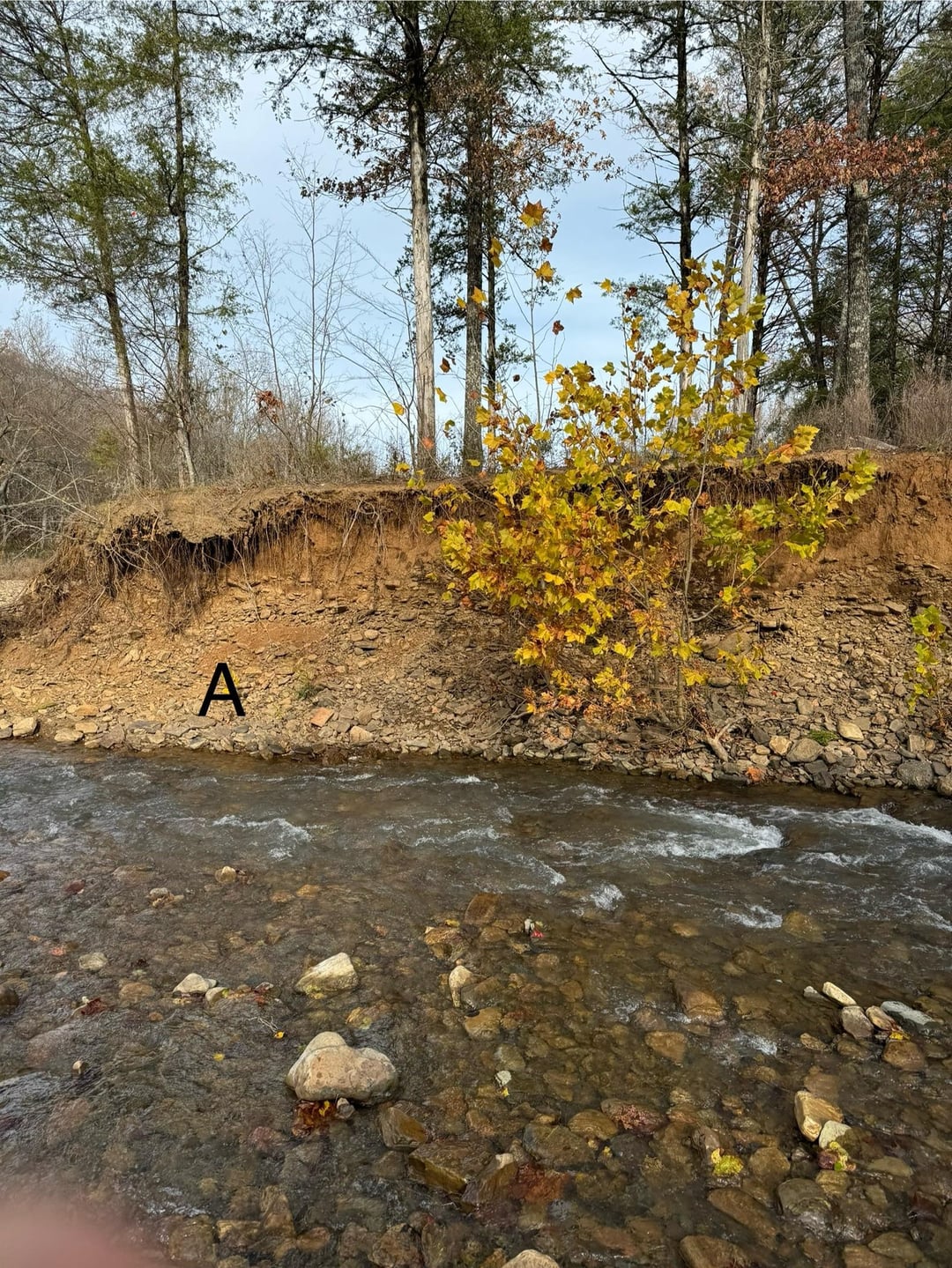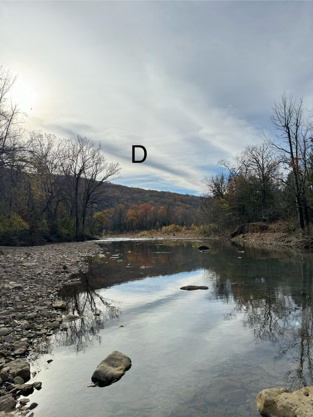 I often fish spots in creeks that have shallow water down and upriver like in picture A. In picture A you see one single creek on the right that feeds into another creek as seen in picture B. Where I was fishing starts at that current/dropoff in picture B where both creeks feed together. This type of water always produces for me during Summer. I used a black wooly with a split shot 5” up from the fly on a 9 ft Rio Bass leader. No bites whatsoever.