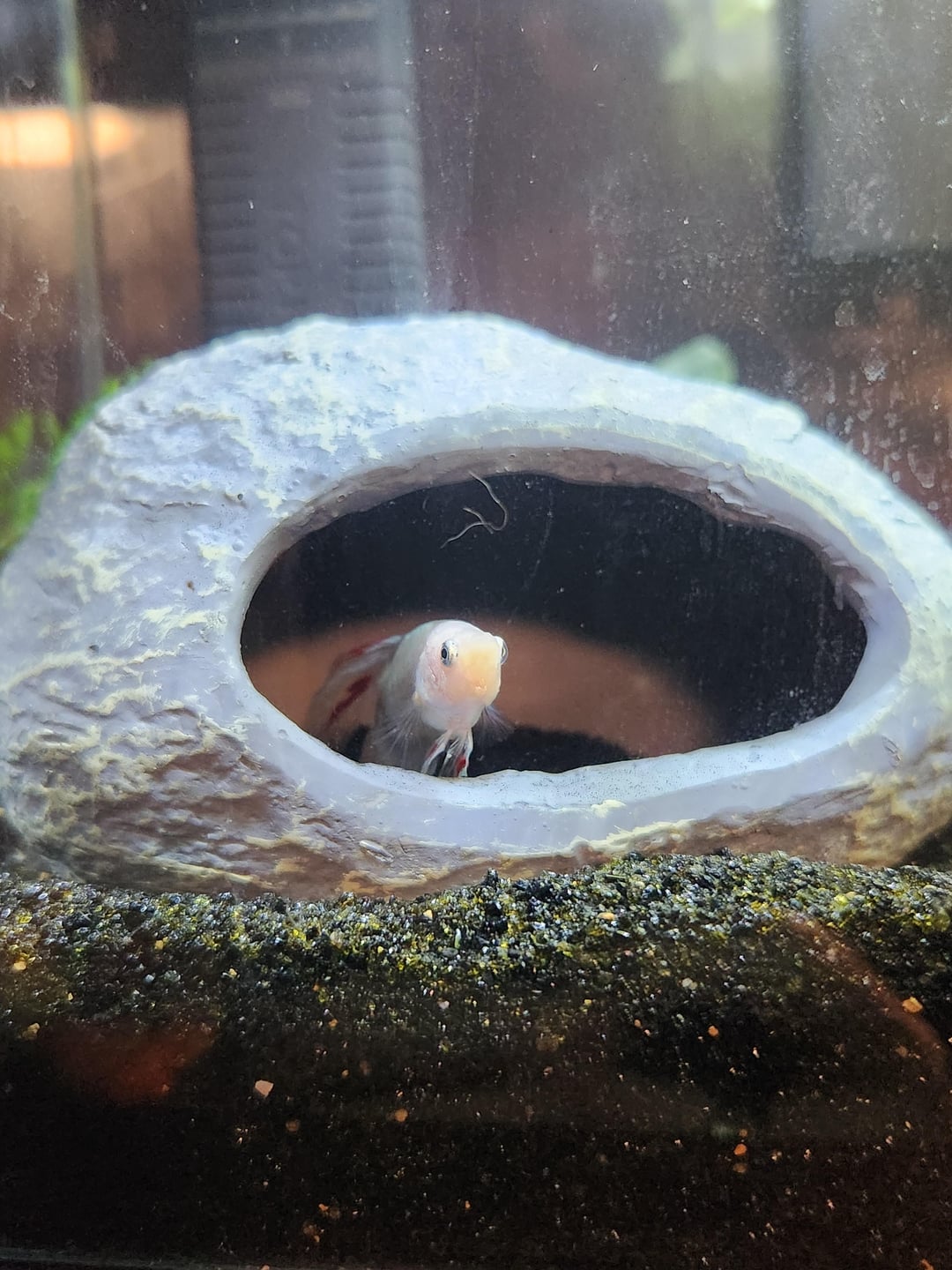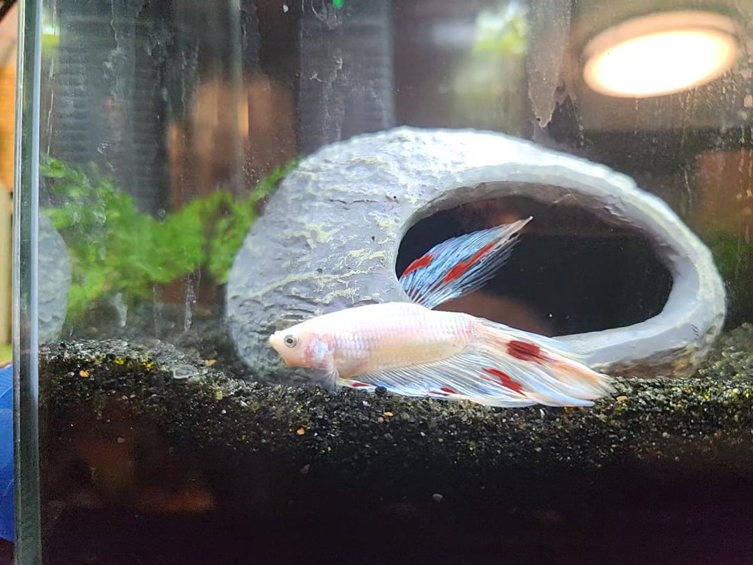 Just got this delta tail from Petco after cycling my tank for a month. I'm alittle concerned with how his back fin is clamped together, but he's pretty good. Keeps trying to fight himself in the reflection and trying to eat the floating plants lol