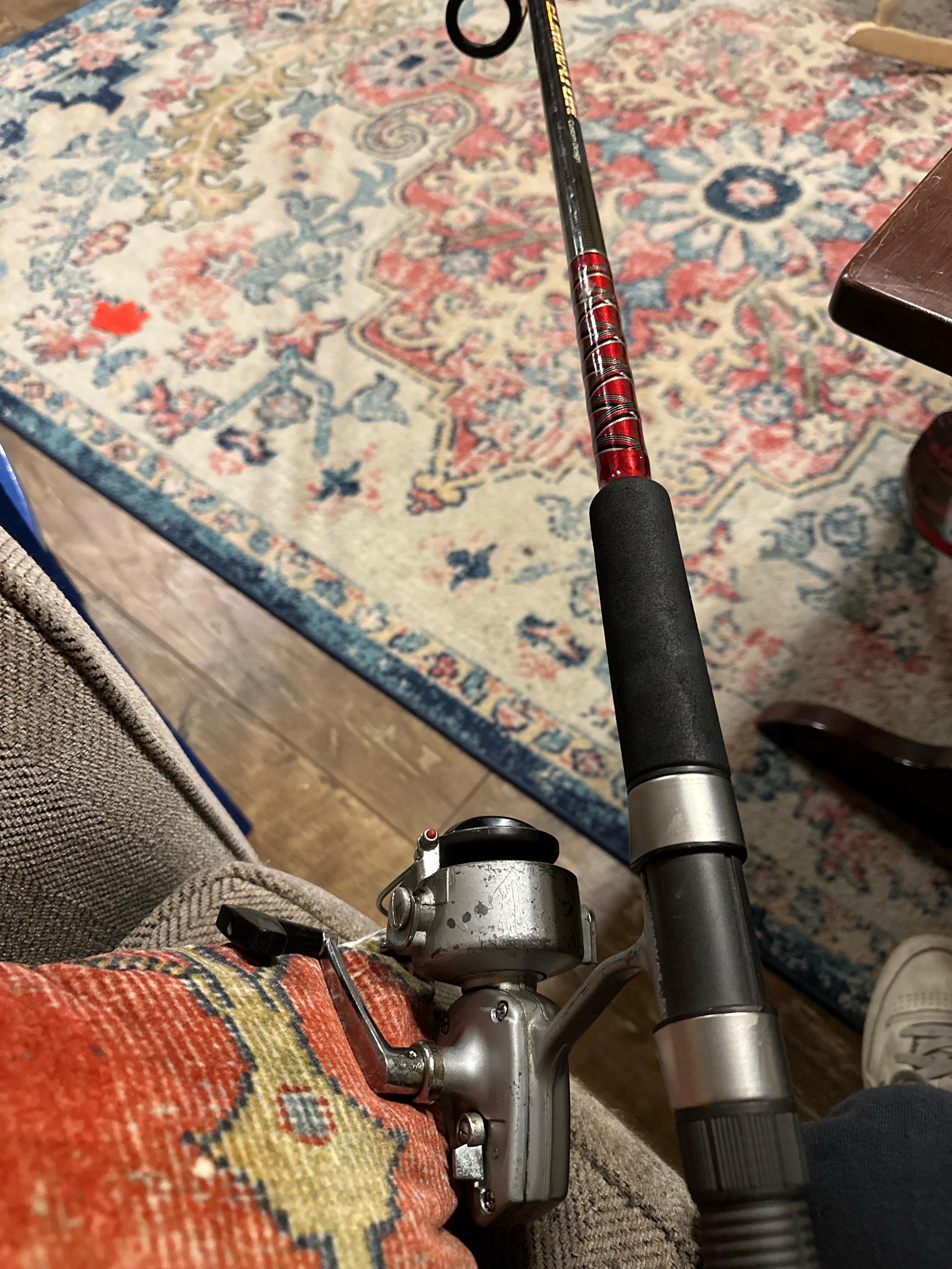 I would upgrade that reel and put some braided line on the new one. Like Power Pro or Fireline. That reel looks a little small. Although, it’s hard to tell. Maybe just buy some 20 or 30 pound test braided line and try your luck. Also how long is the rod?