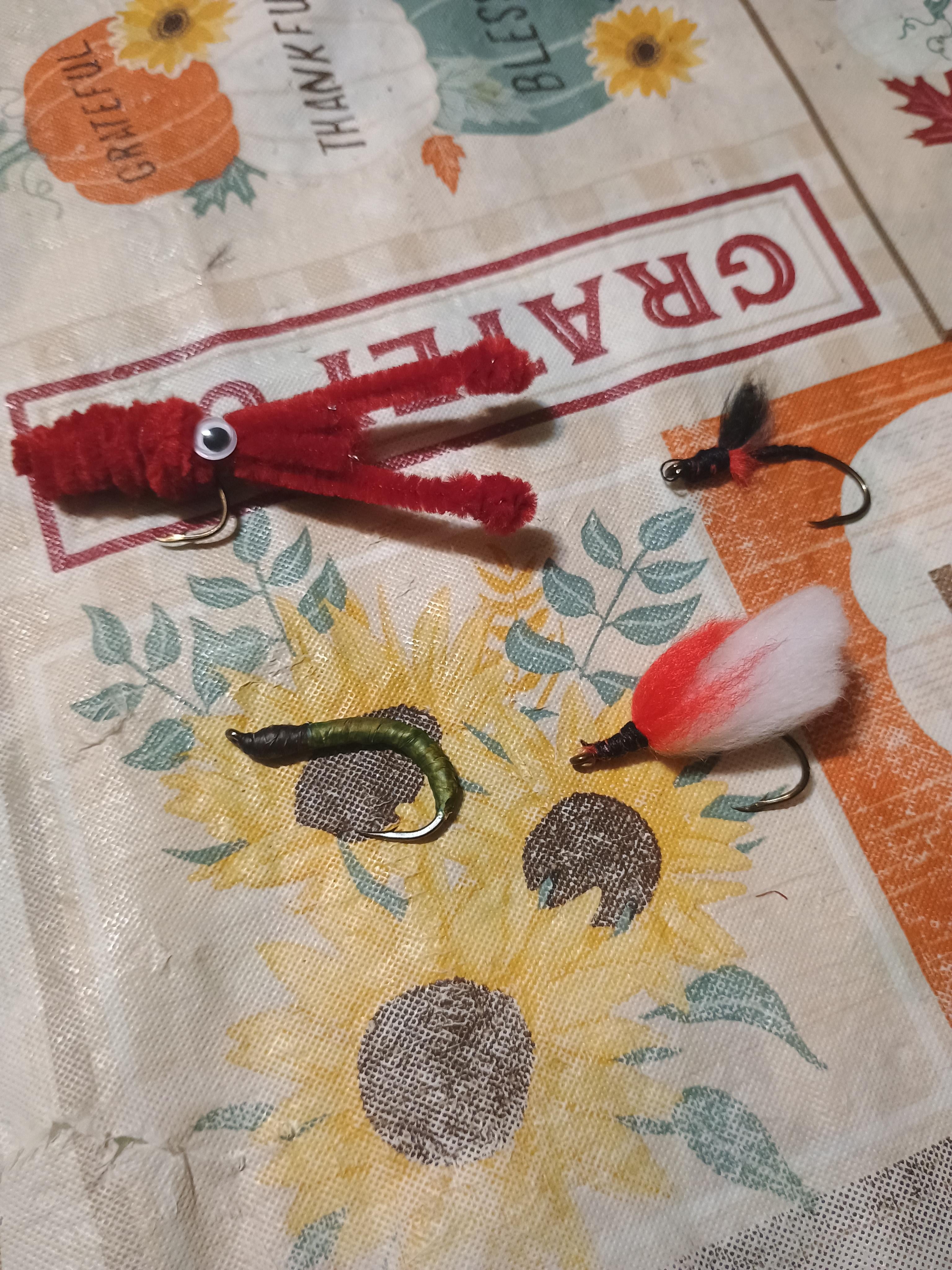 Made a few more in recent days. A decent looking streamer and one that I didn't get secured good enough. It still looks ok, so I kept it. I also made a squid that turned out pretty well, although the googly eyes are definitely going to fall off at some point, and a Caddis larvae imitation.