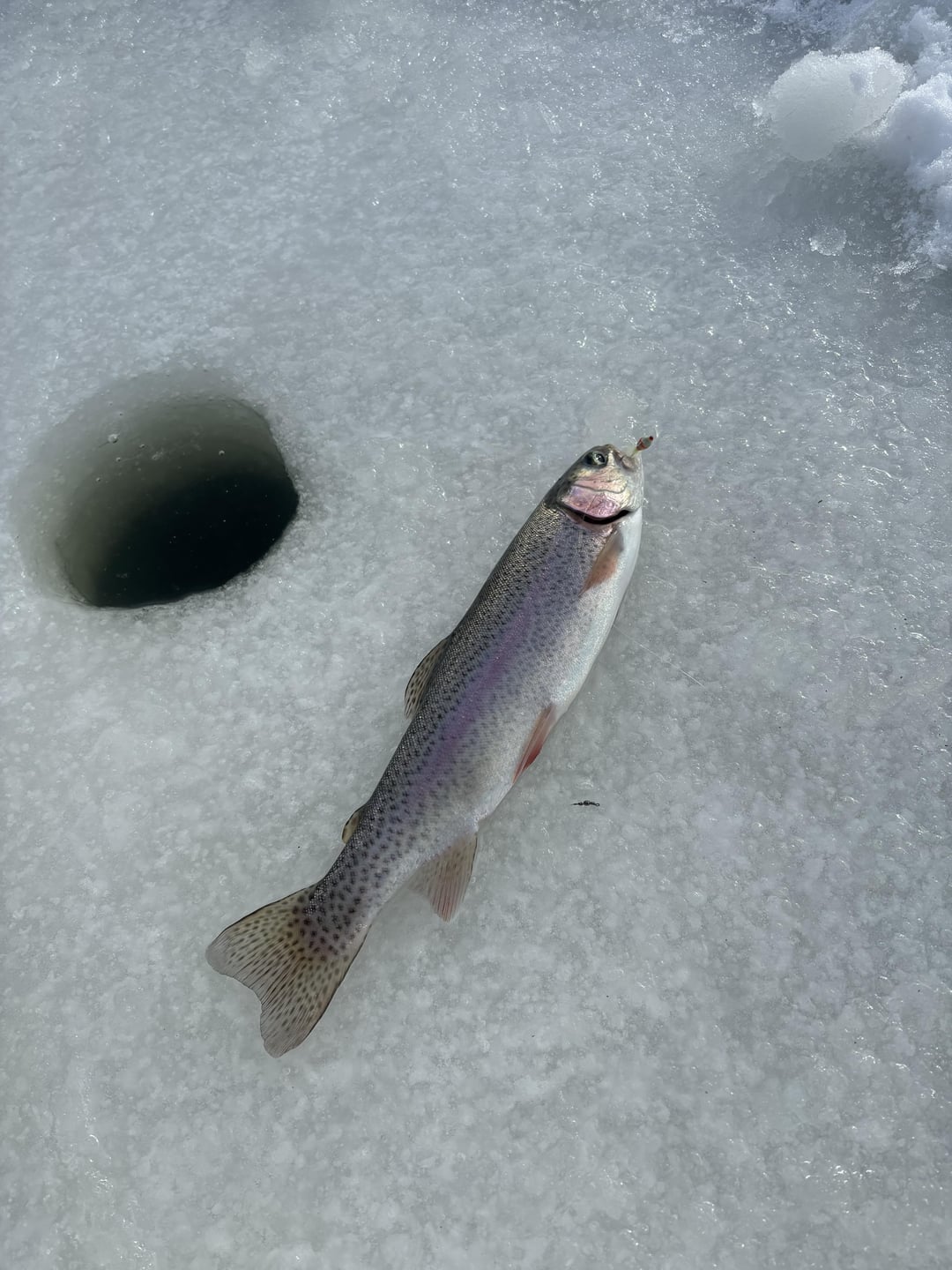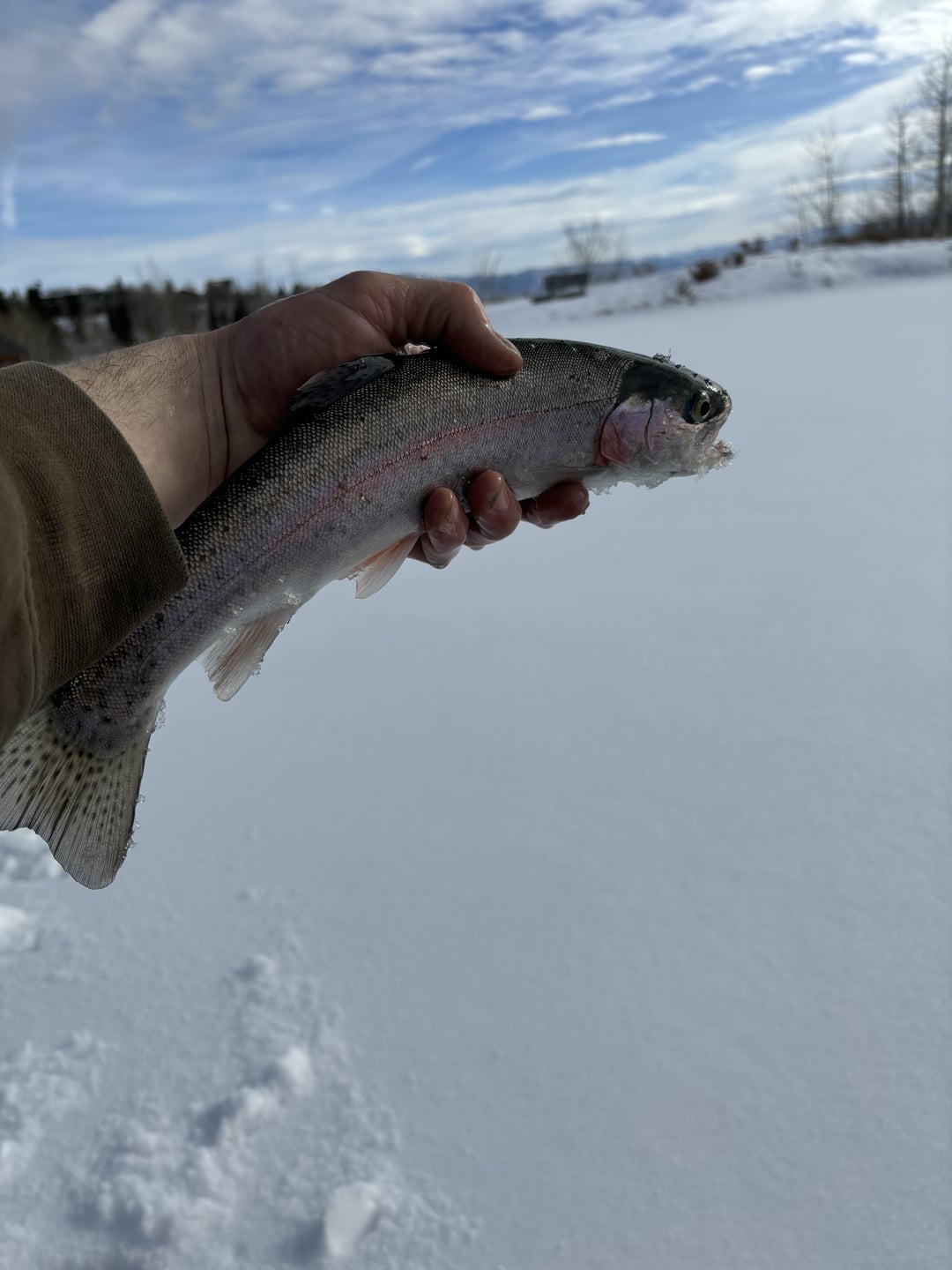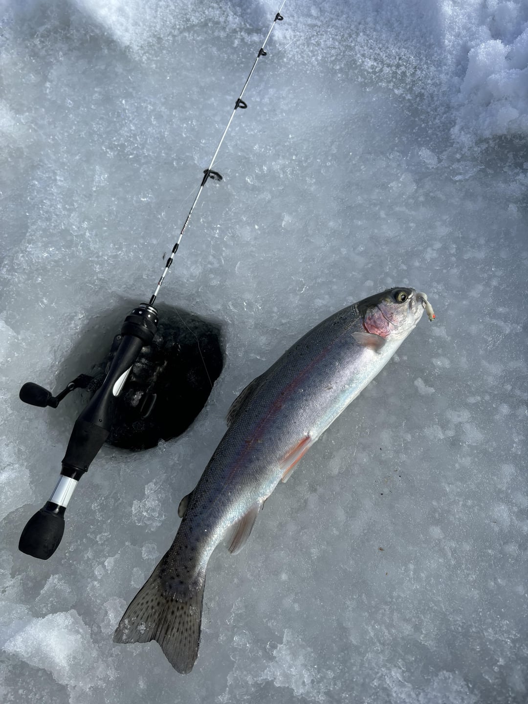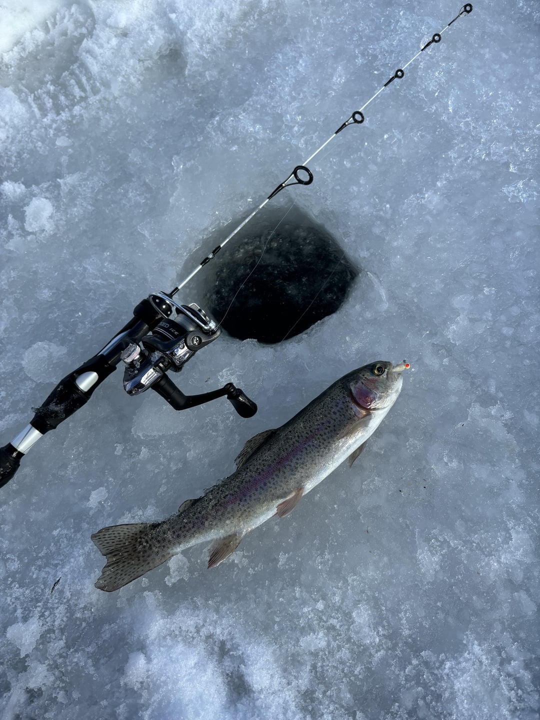 Ice fished the pond in my neighborhood for the first time. Caught a few Rainbows on small jigs. Posted by Fabricobbled_Factory