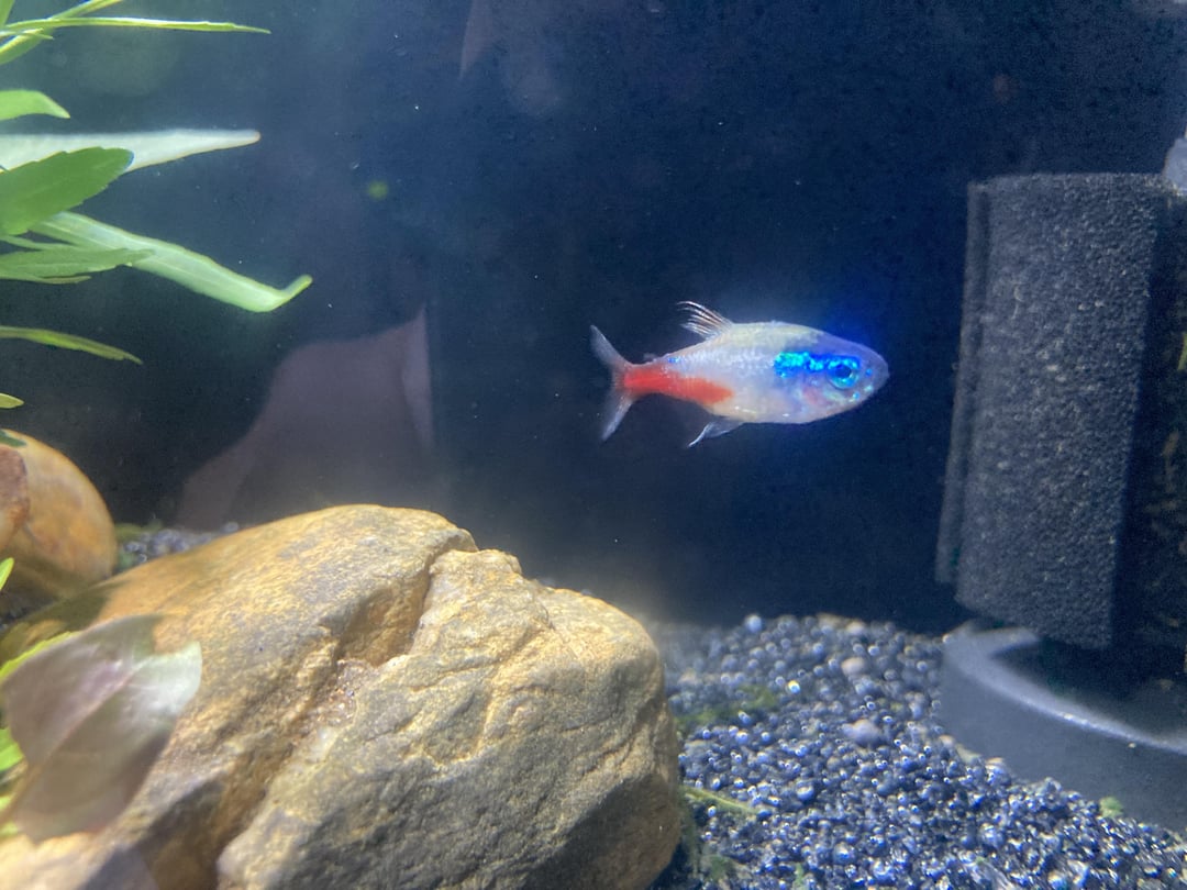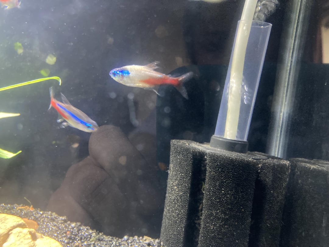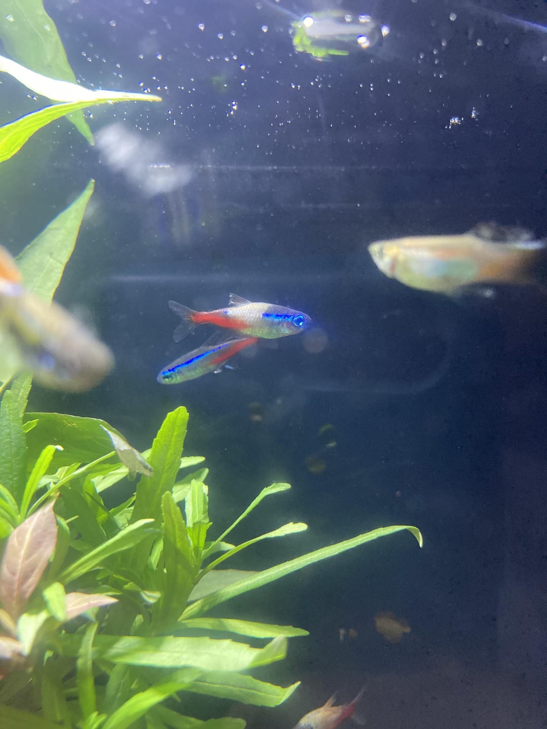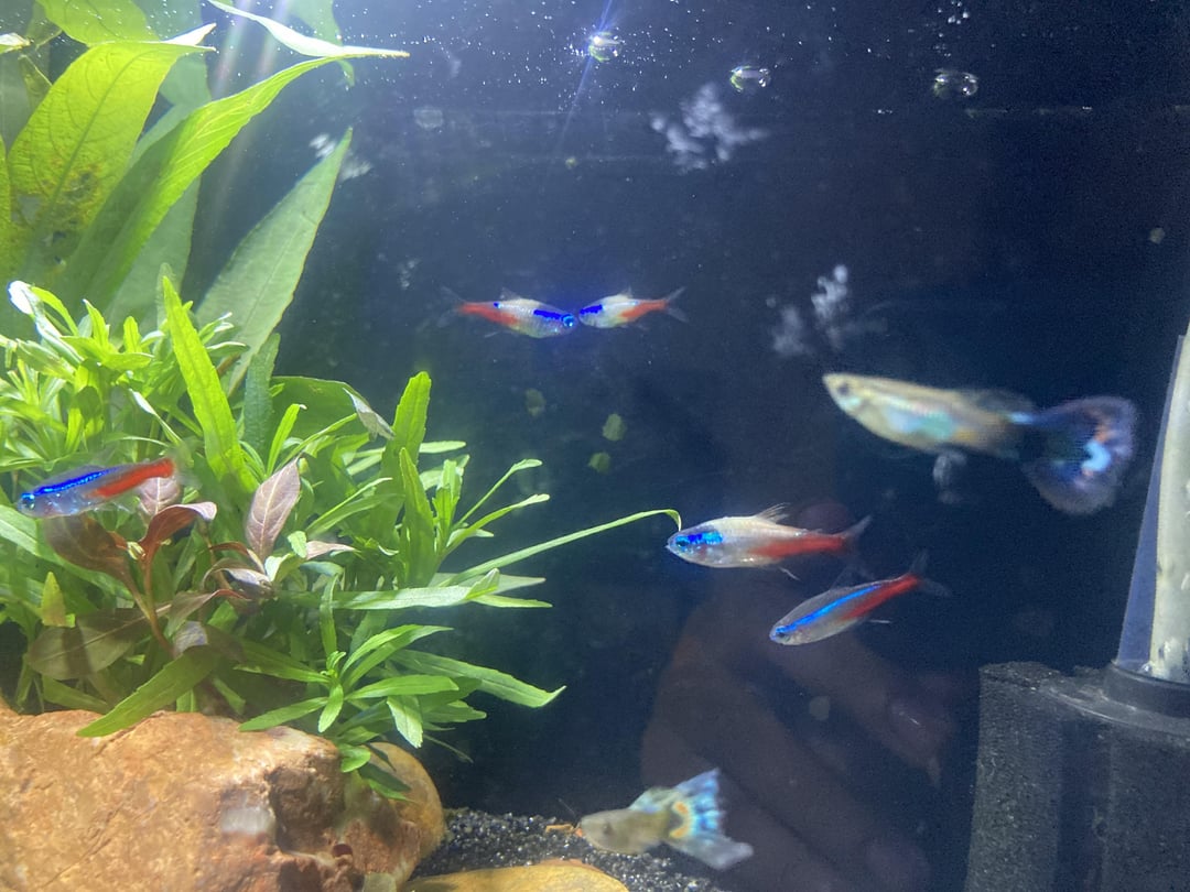 My brother bought 6 neon tetras almost a week ago and they live with 6 guppies.