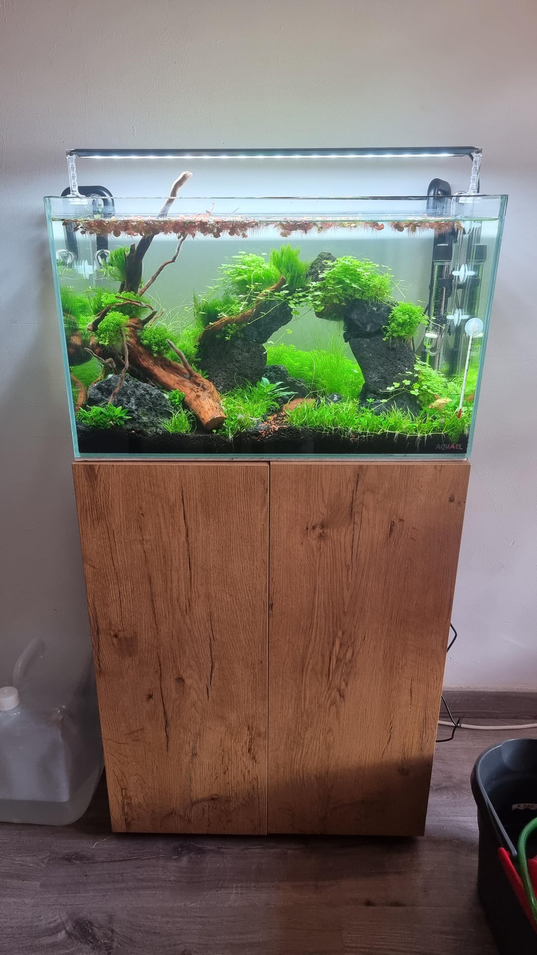It’s a 60L tank set up three months ago, densely planted, with technical substrate, JBL CRISTALPROFI e702 filter, Chihiros Serie A lighting, and CO2 injection (adjusted according to the drop checker reading in the aquarium). The water temperature is set at 25°C.