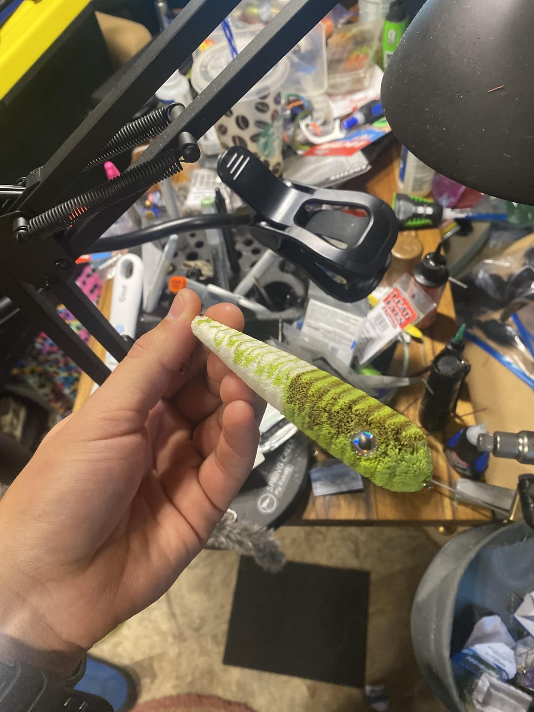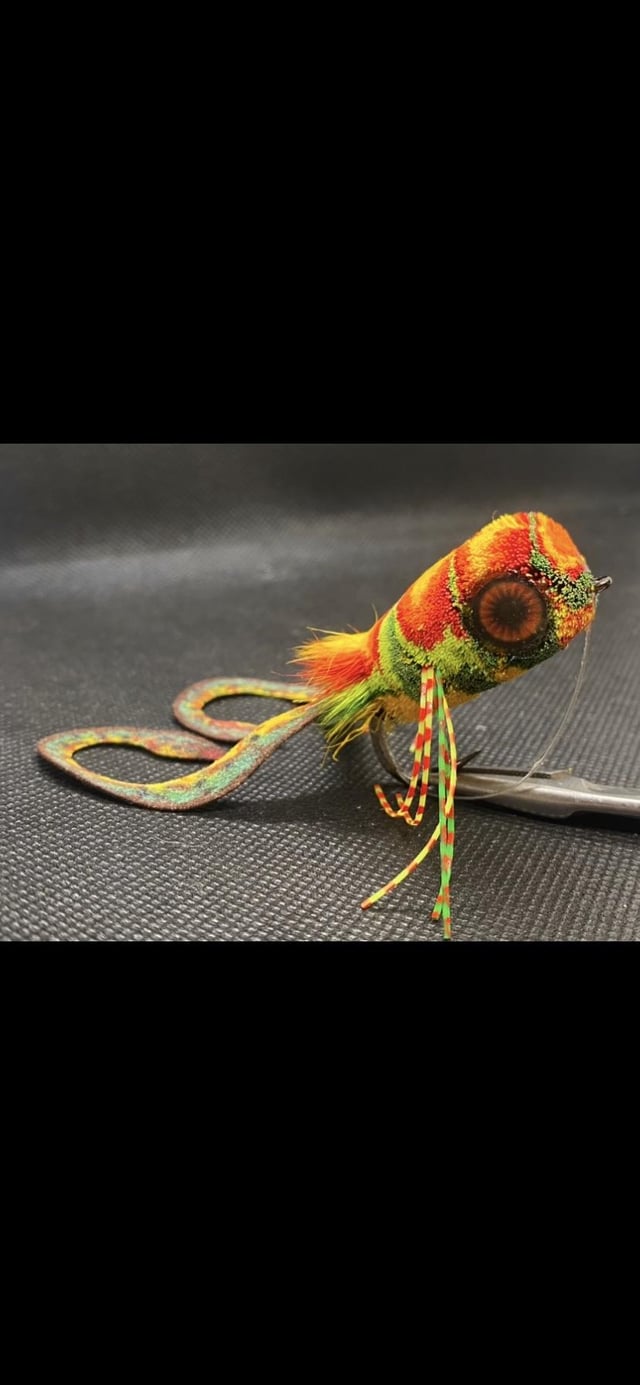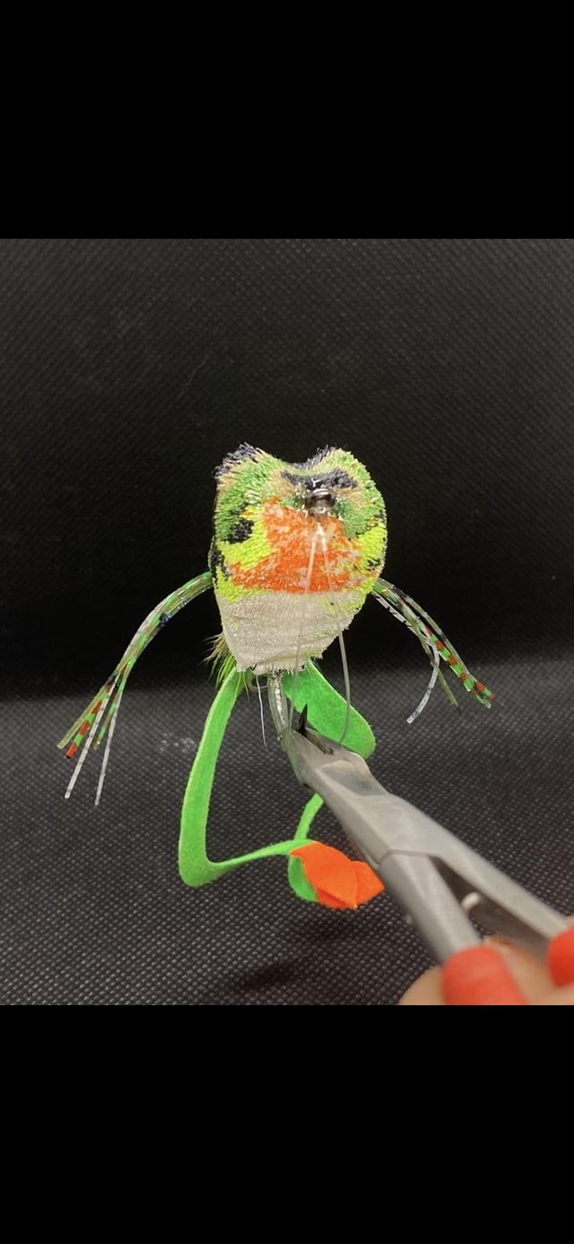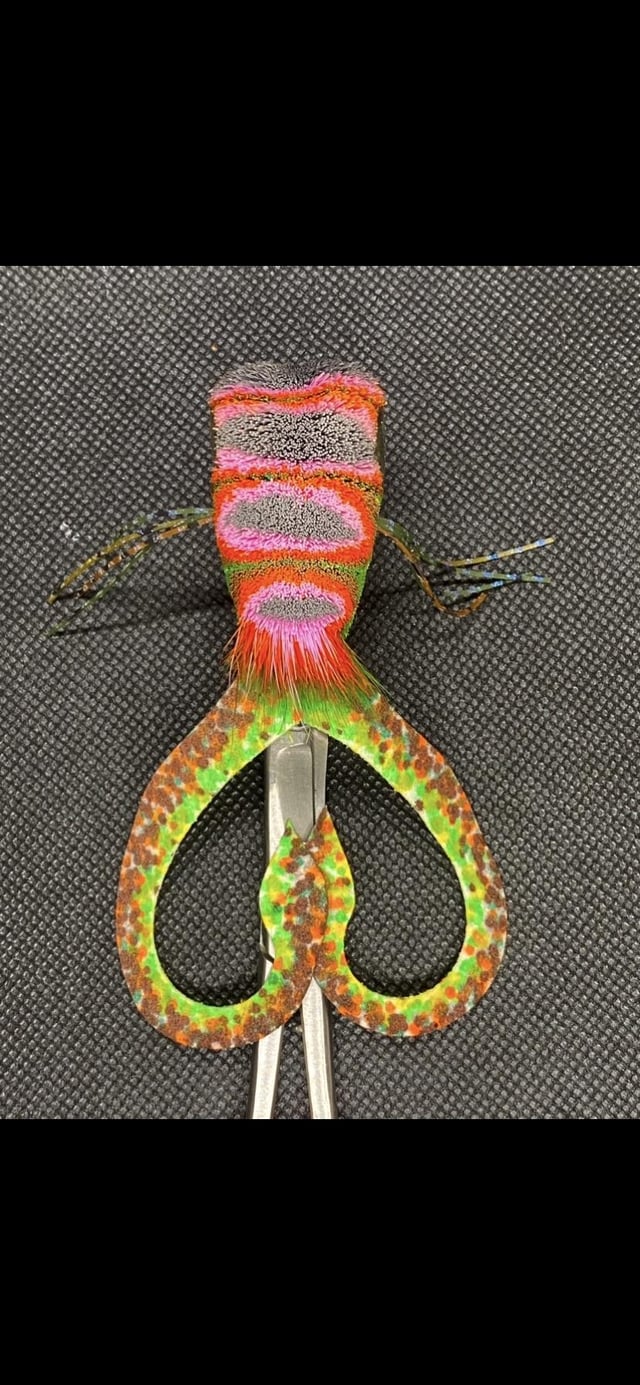 Large lead eyes on back. 20lb double flouro weedguard. 6 layers of hair. Inset eyes with 2 different types of glue reinforced to the middle of the fly. Semperfli 300d thread.