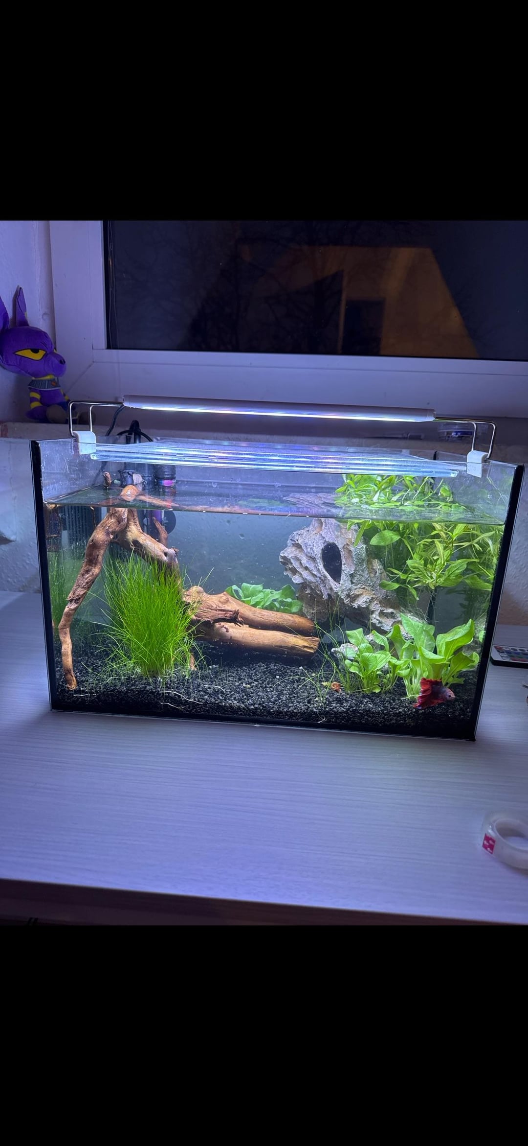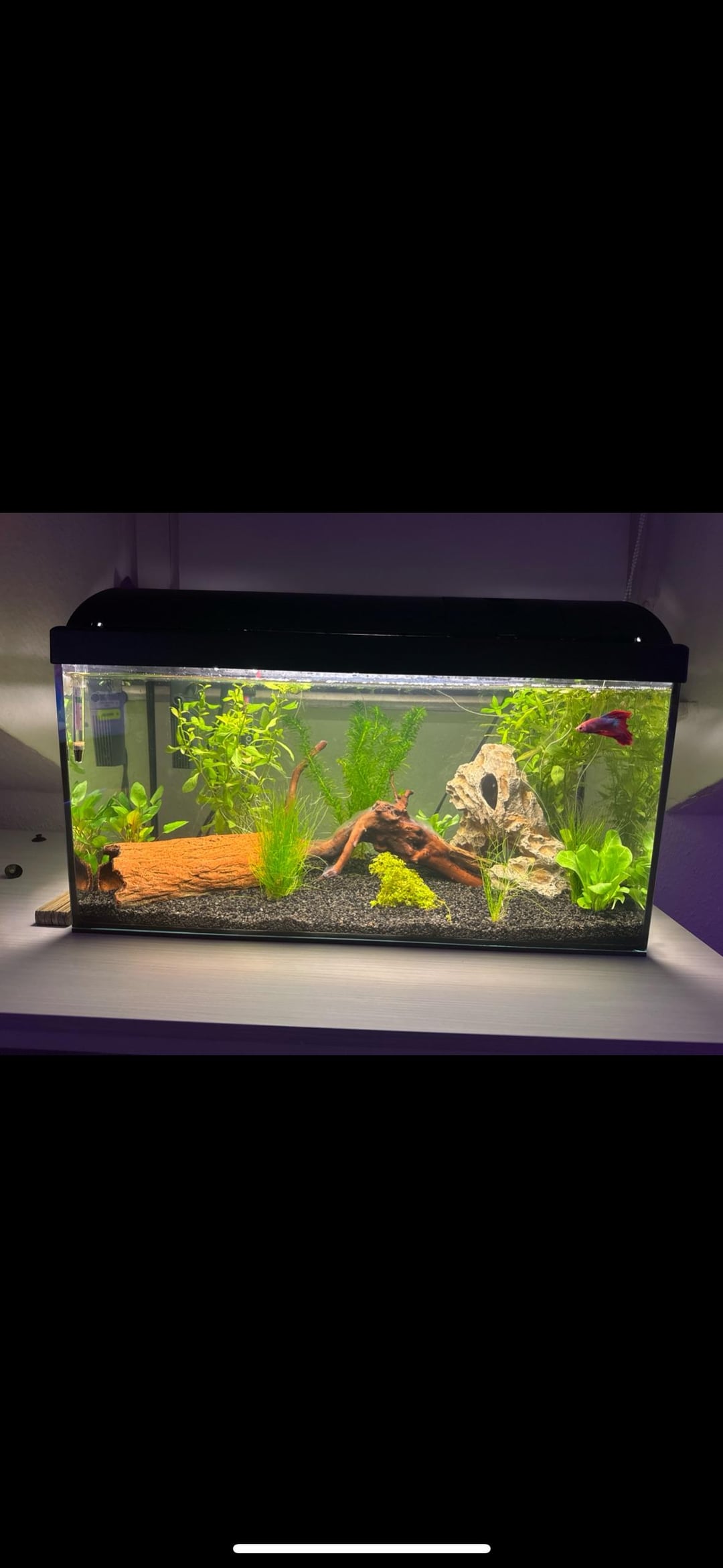 Betta Fish: How it Starts, and now. I will buy more plants but This is the stand ( First 2 pictures Are 25 Liter, and now 54 Liter)