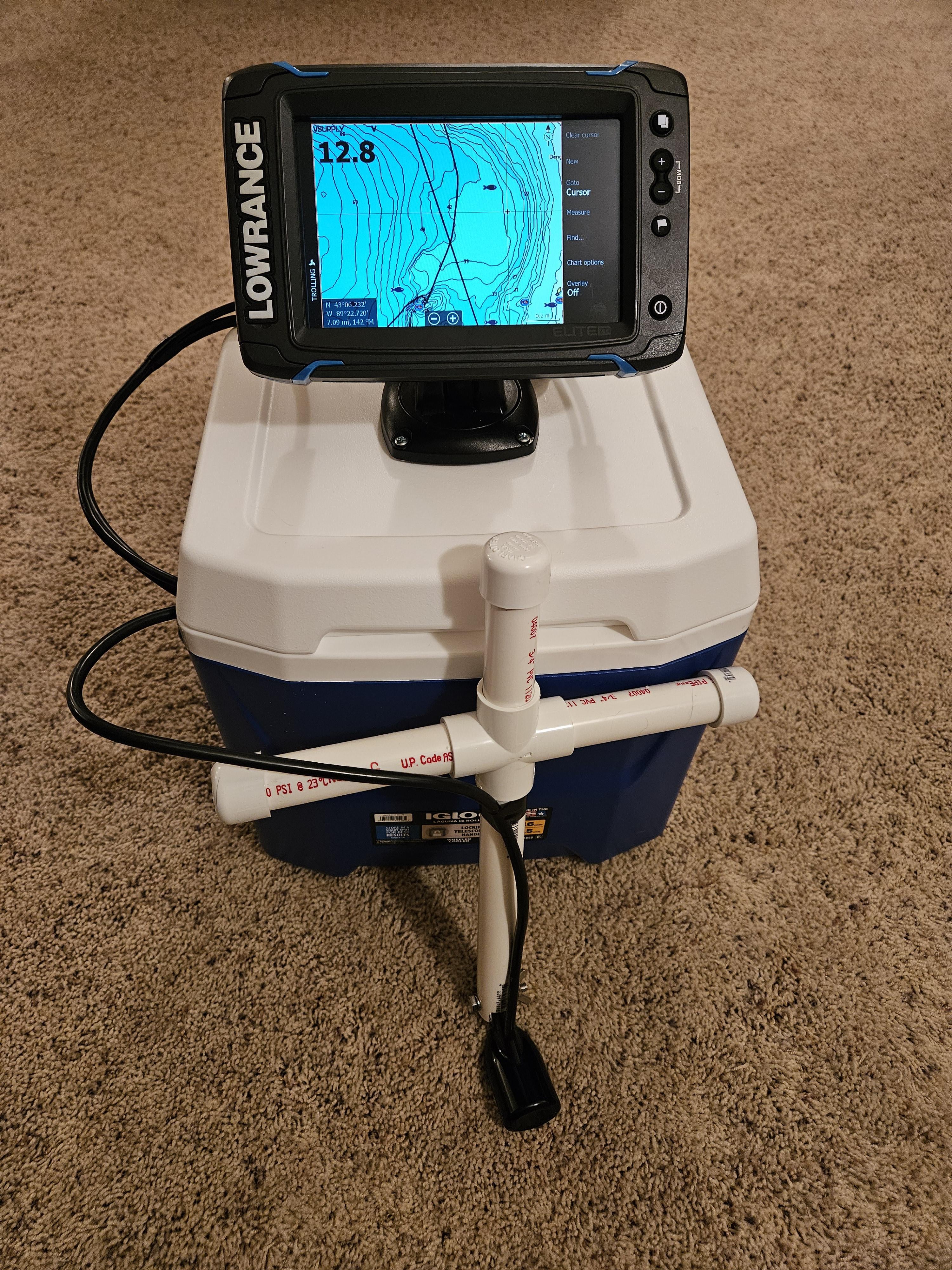 1. Decided to go the budget route and pull my lowrance elite ti7 off the boat, mount an extra open water transducer on 3/4″ PVC, and throw a 12v battery in an igloo cooler (16 qt). The transducer arm pulls apart to fit in the cooler and the unit disconnects to fit inside as well. It’s a bit larger than a proper shuttle but was cheap and has a handle.