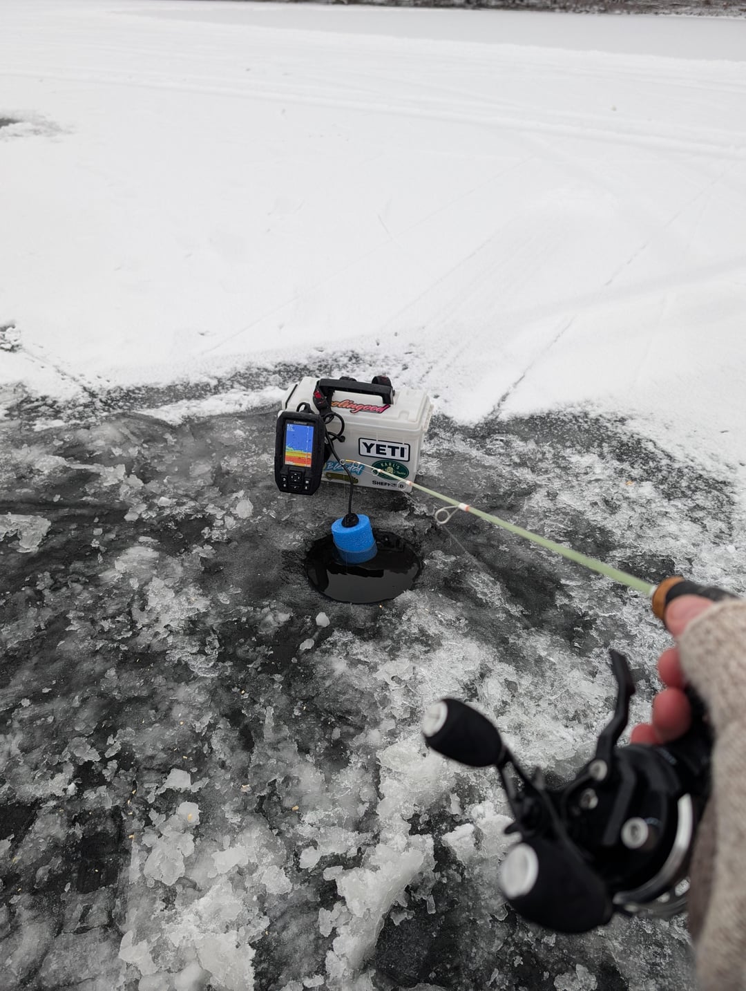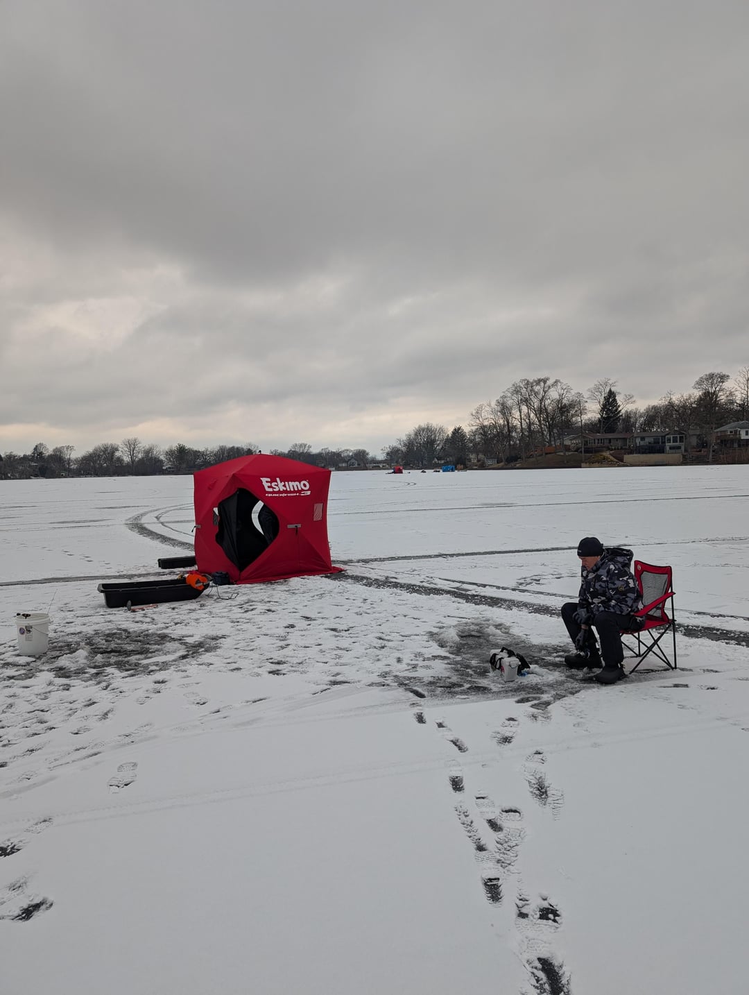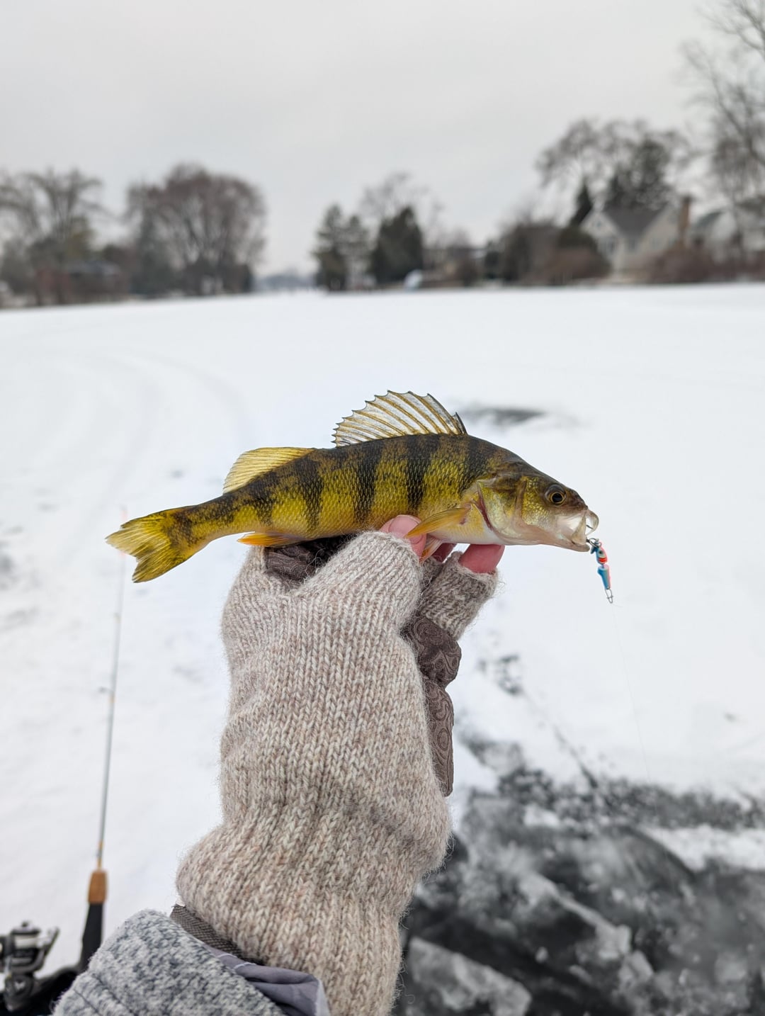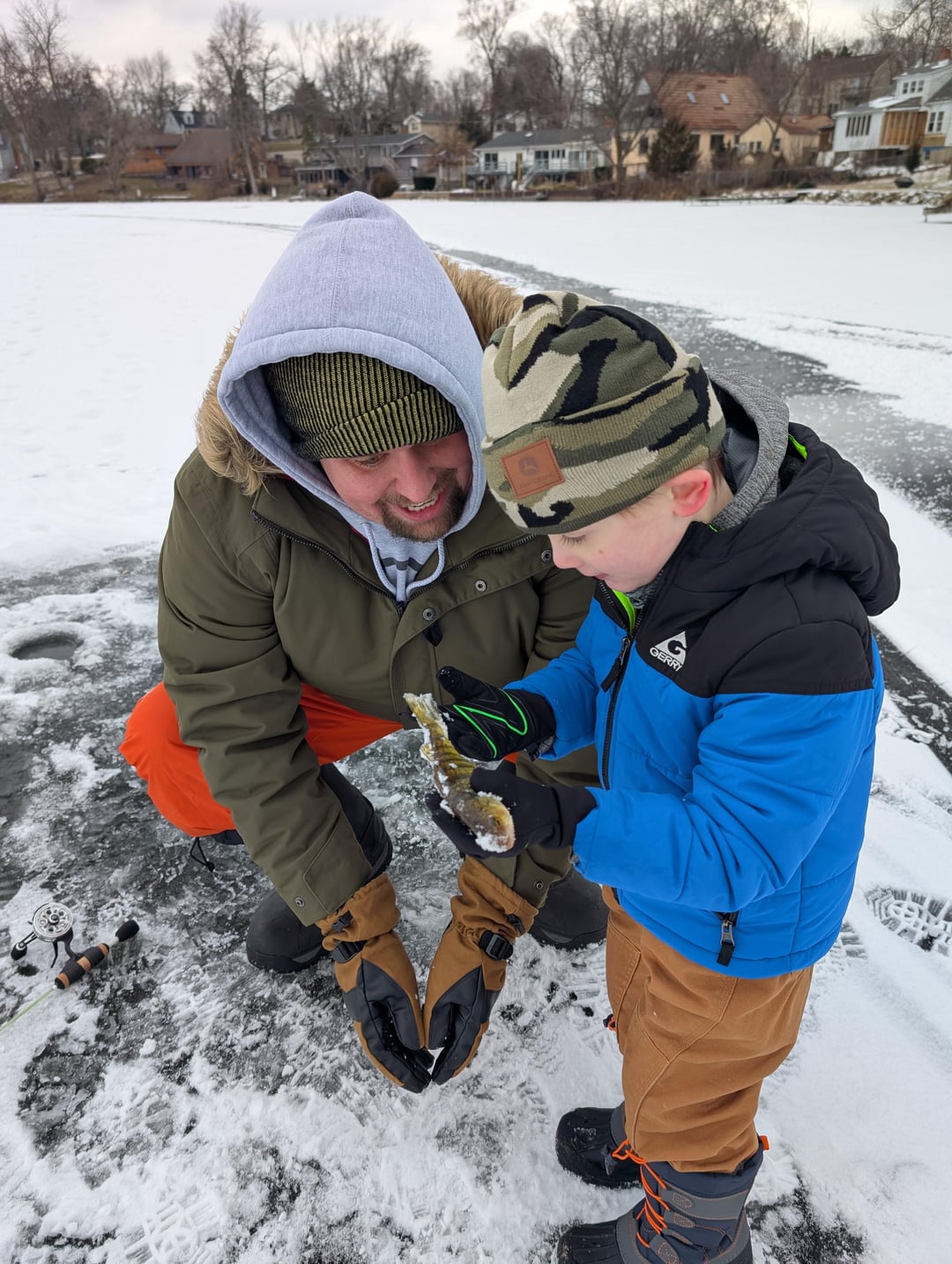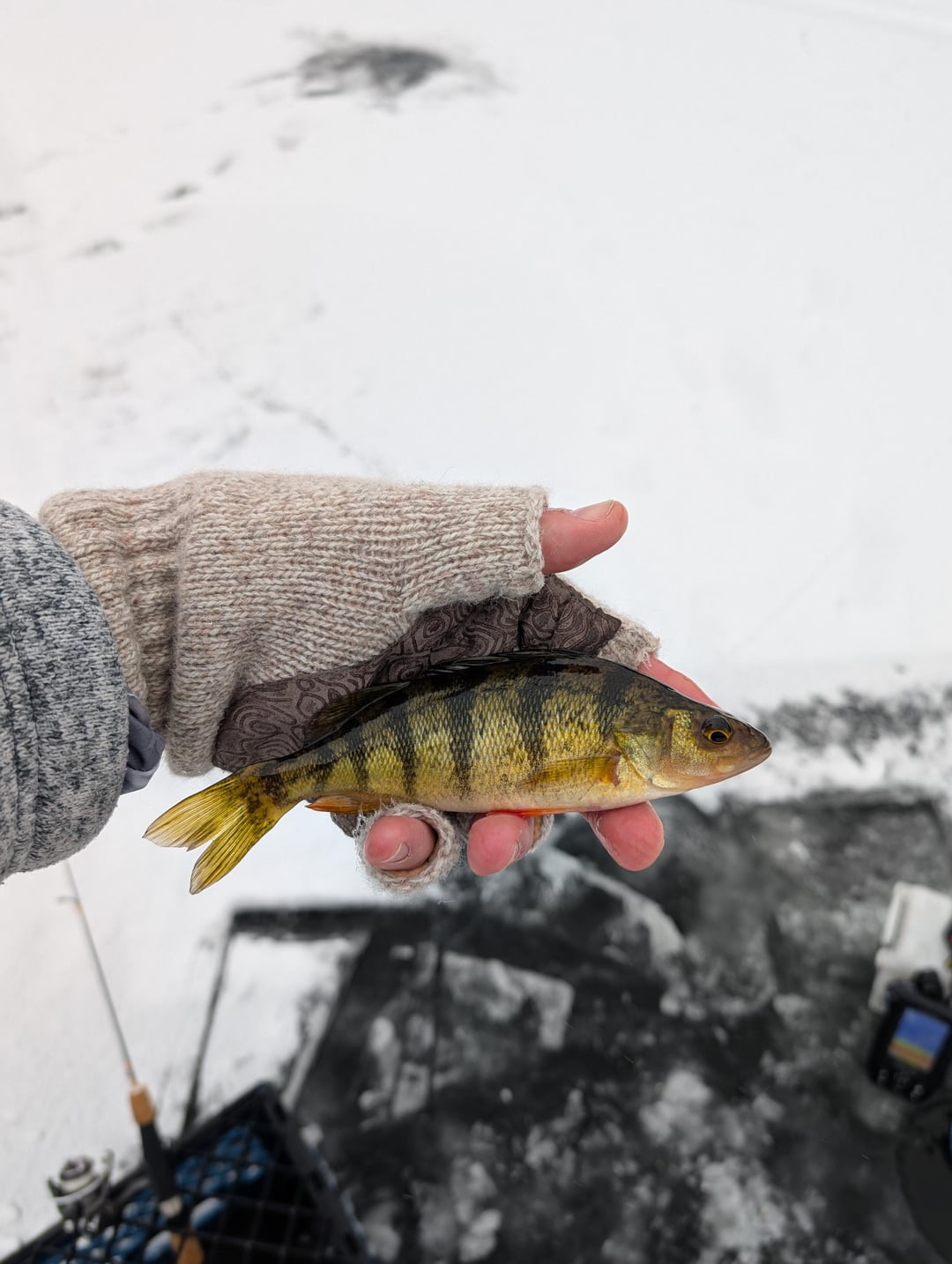 Fun day on the ice today with family and friends.. A couple dozen small perch and gills all thrown back, some swinging and a dinosaur.
