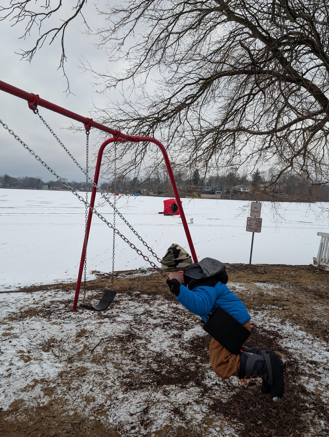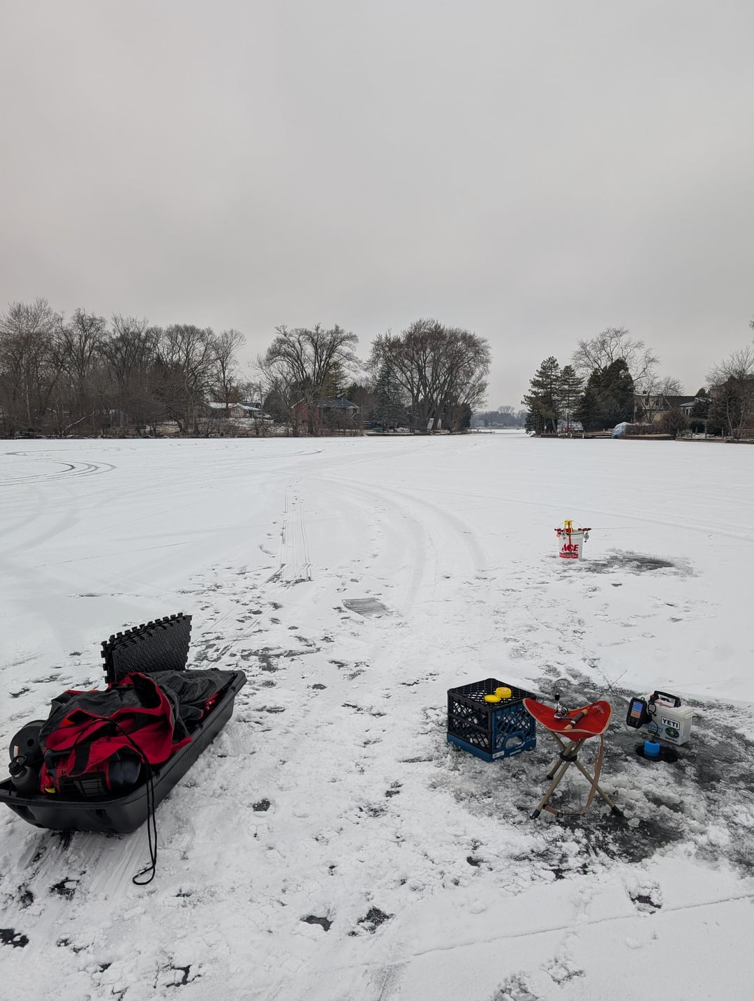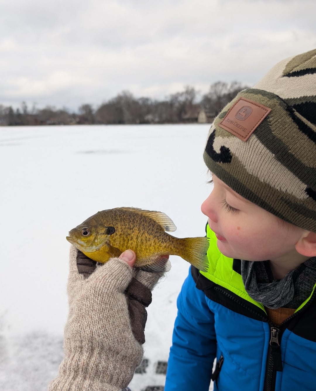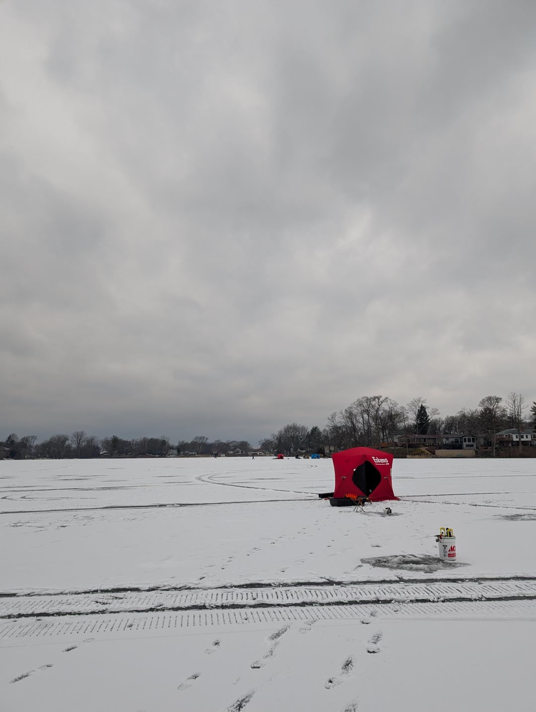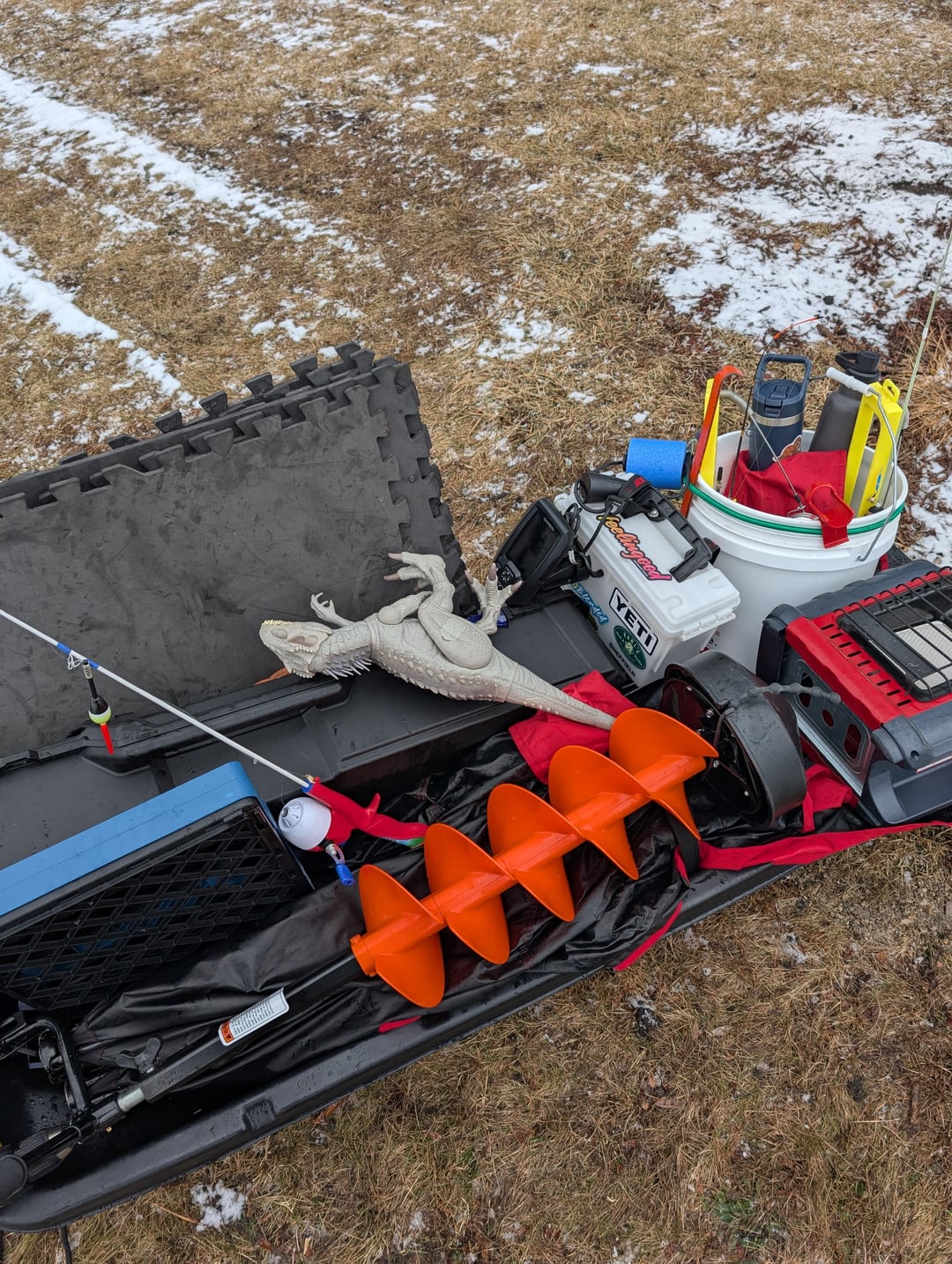 Fun day on the ice today with family and friends.. A couple dozen small perch and gills all thrown back, some swinging and a dinosaur.