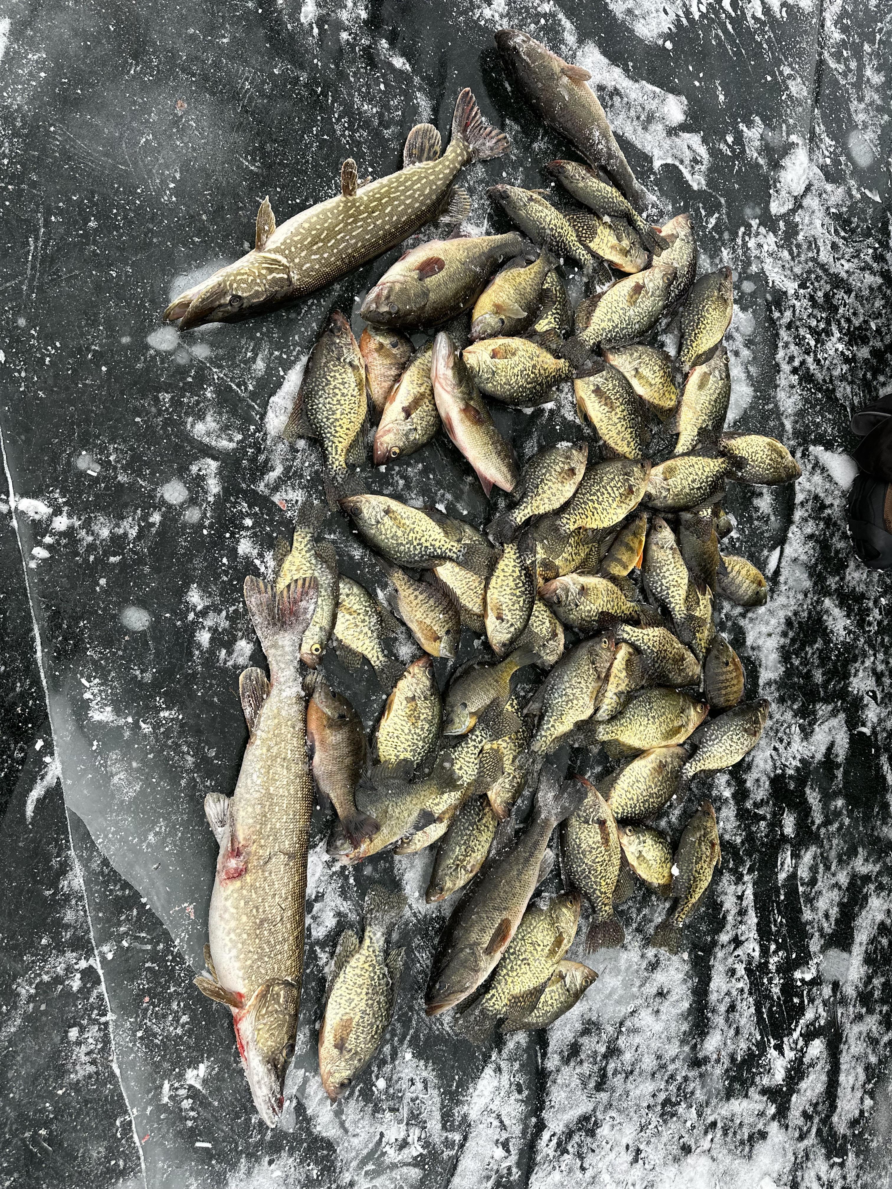 Nice haul for 5 guys in 7 hours on Lake X. Almost all crappie/bluegill were jigging, I think 2 on tip downs. Bass and northern were on tip downs, tip ups, or finicky foolers (similar to Ifish pro I think). Posted by Fly_Guy_Ty17