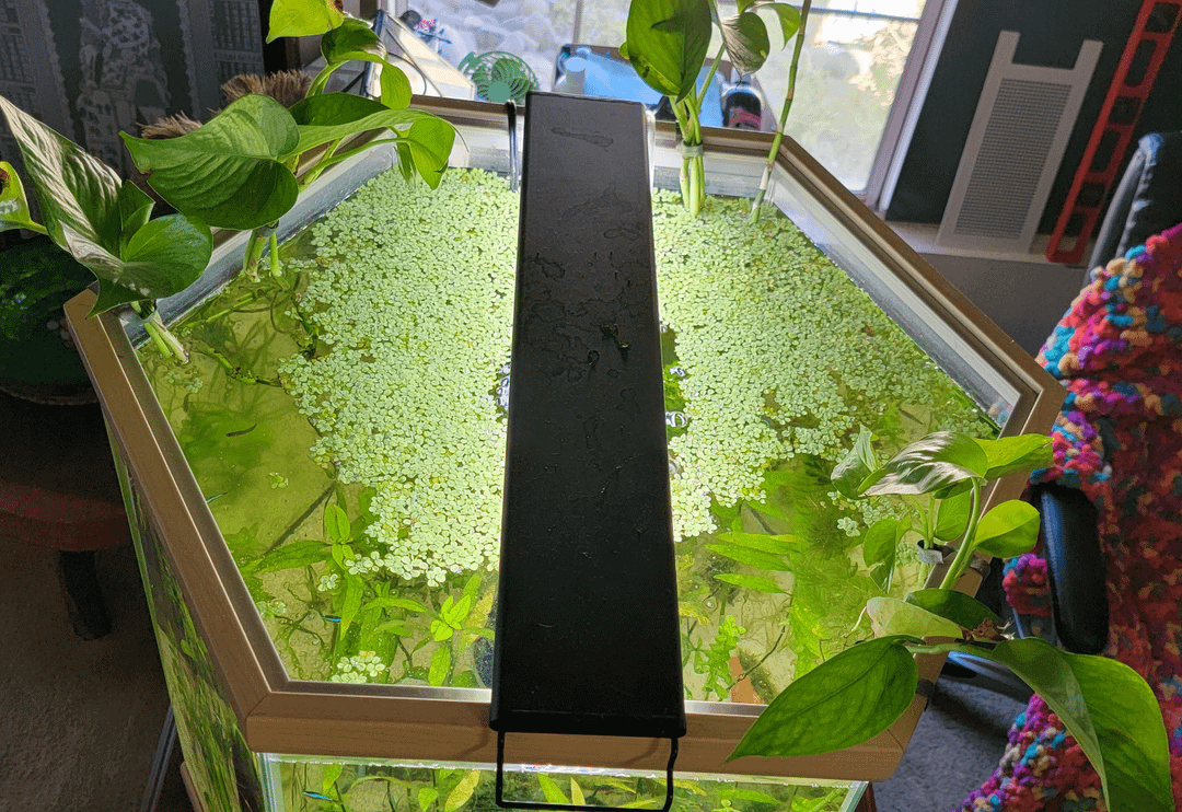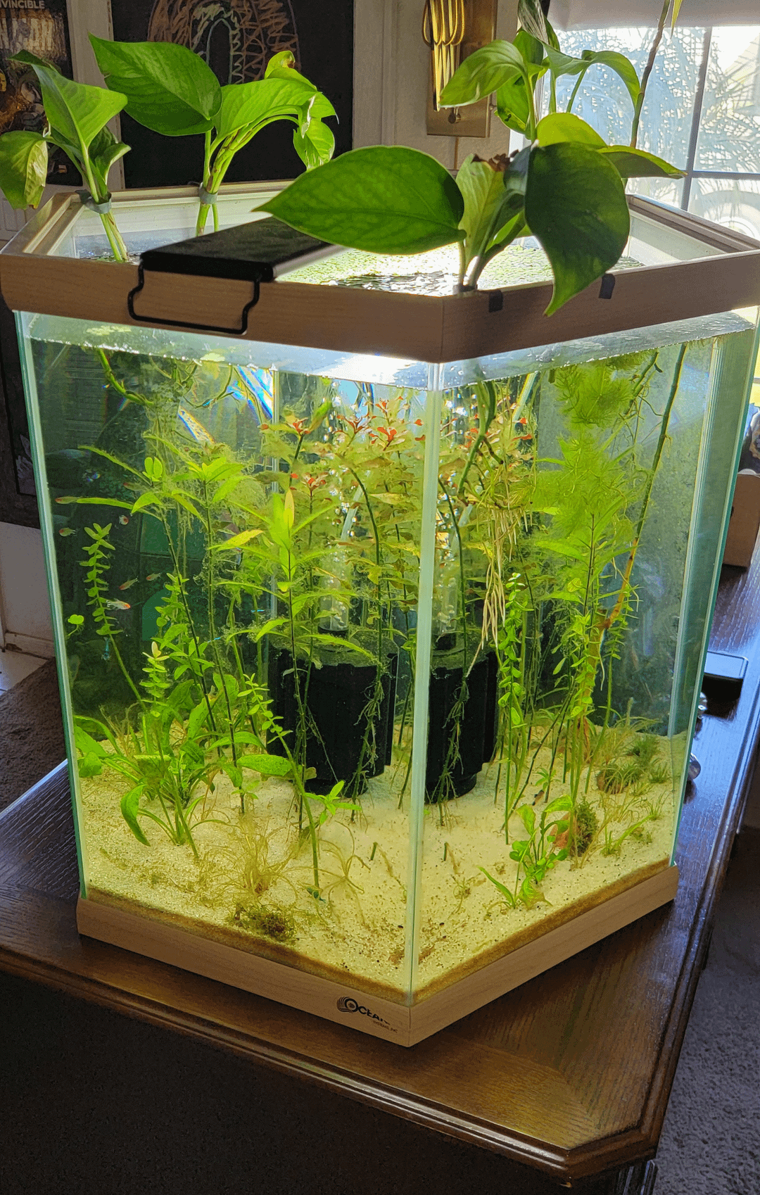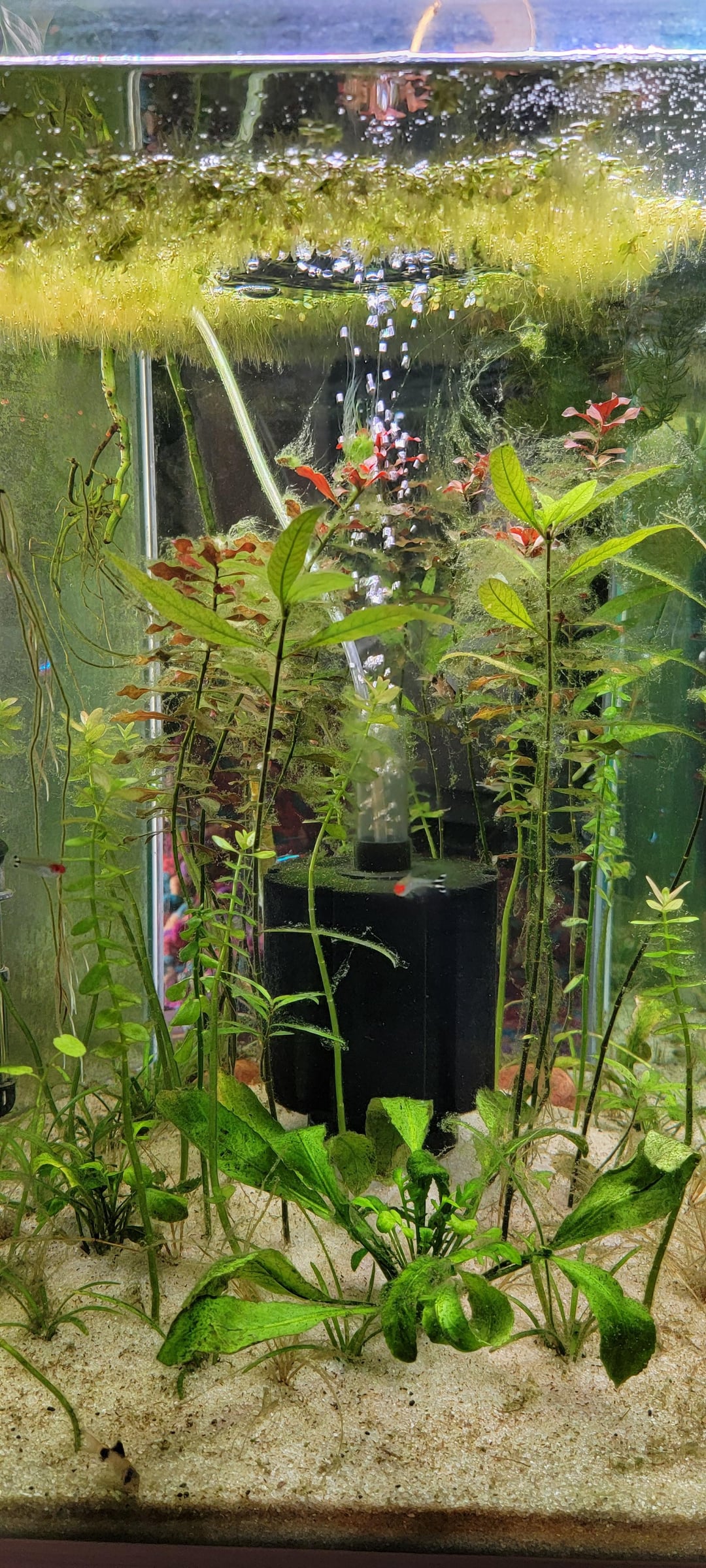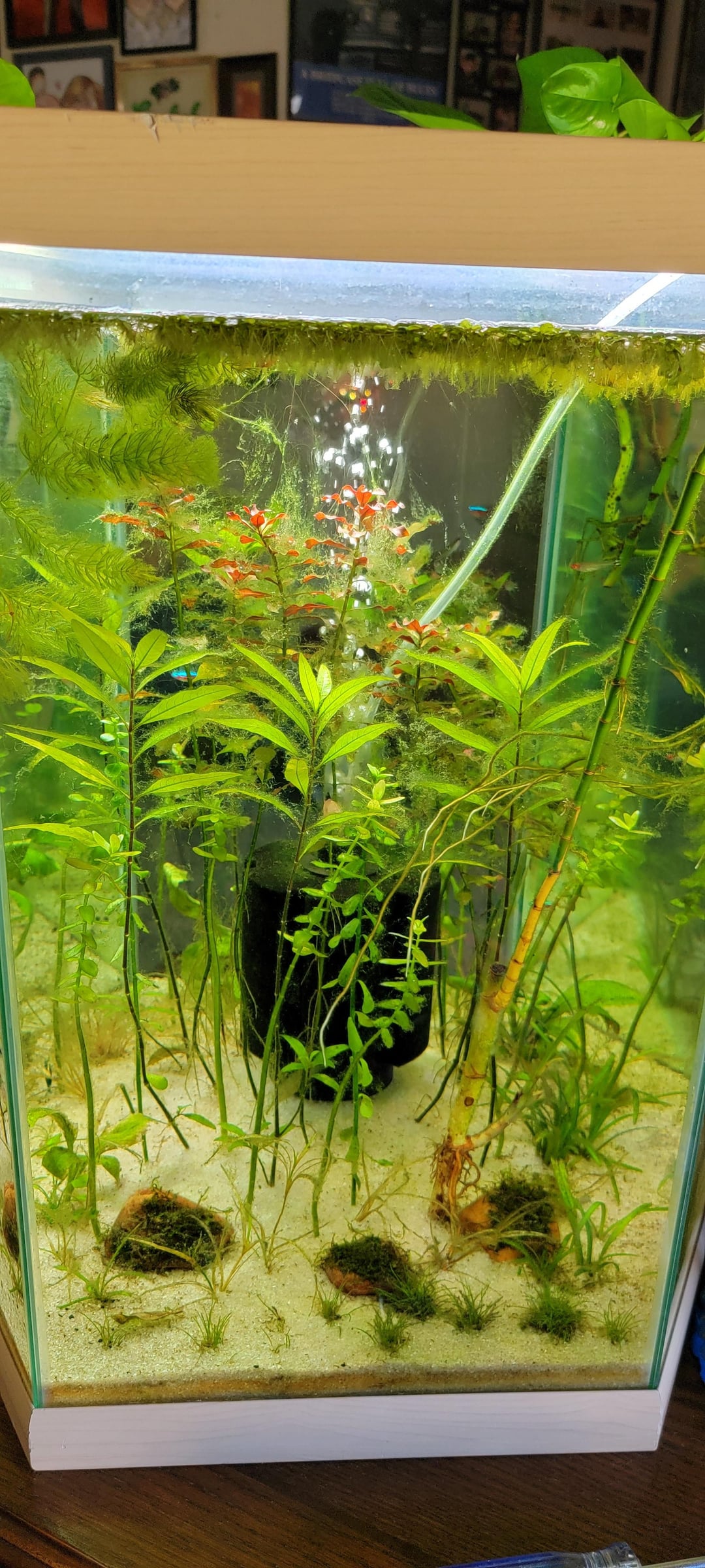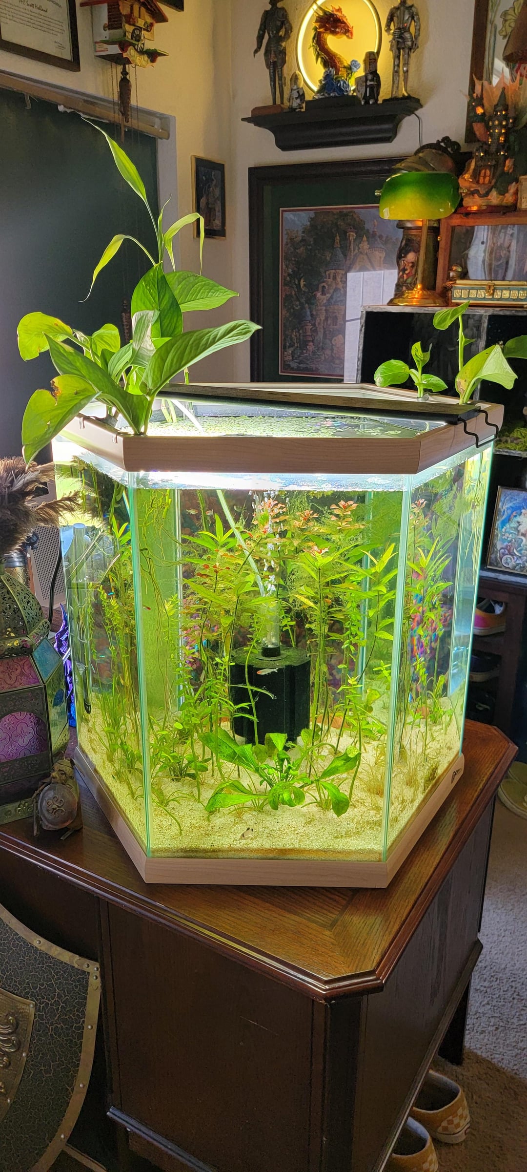The Pothos plant I added a few months ago have been thriving in the tank. New growth is always popping up and the roots seems to be getting very long. Same with the Water Spangle floating on top. It's almost double since I placed it. The only thing I have had issues with is algae growing on some of my plants. I assume it's a light issue, or maybe too many nutrients in the water column.