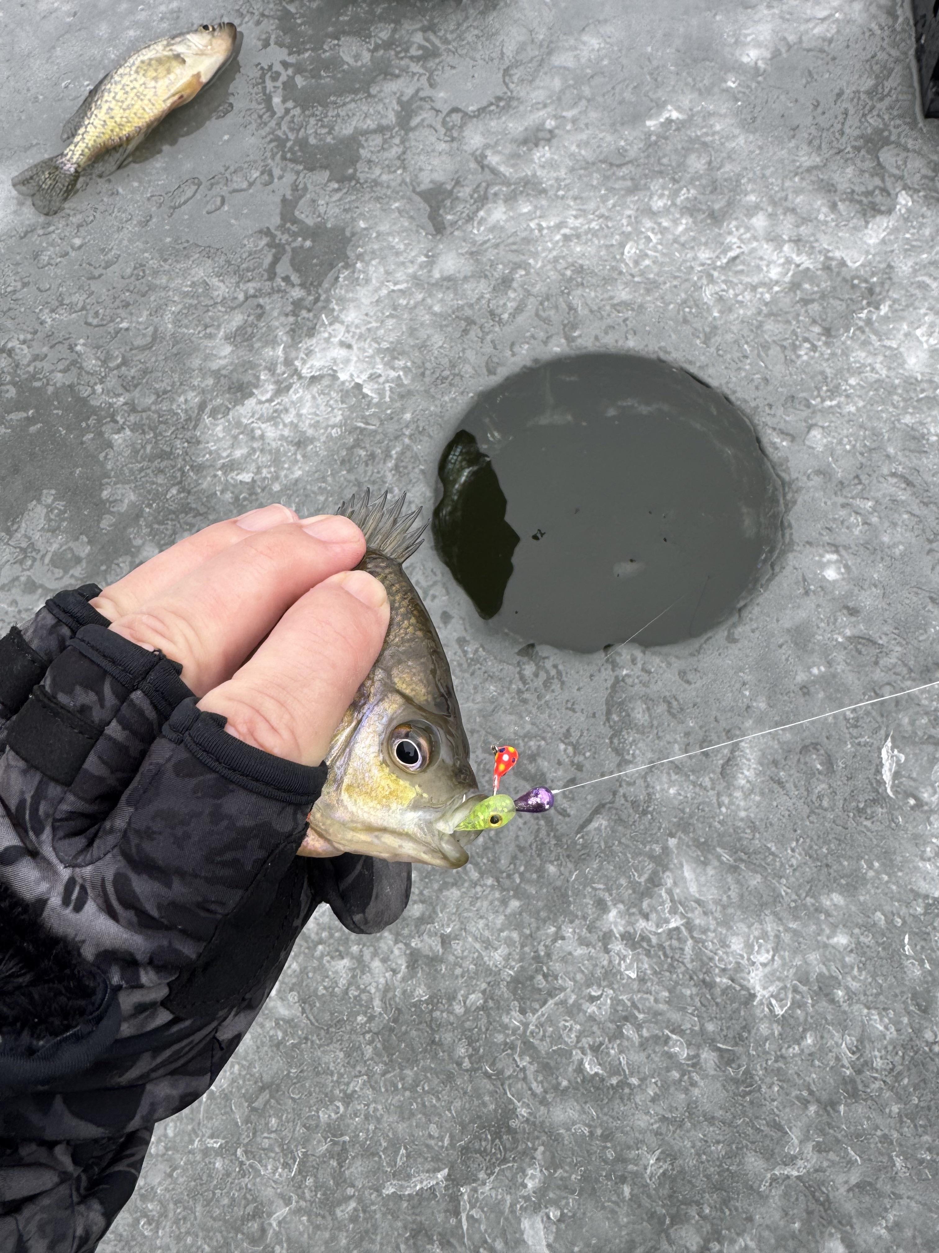 Friend and I were fishing side by side and we both had a fish on at the same time, I reeled in this bluegill to discover that he had taken both of our jigs! Posted by colinwehrle