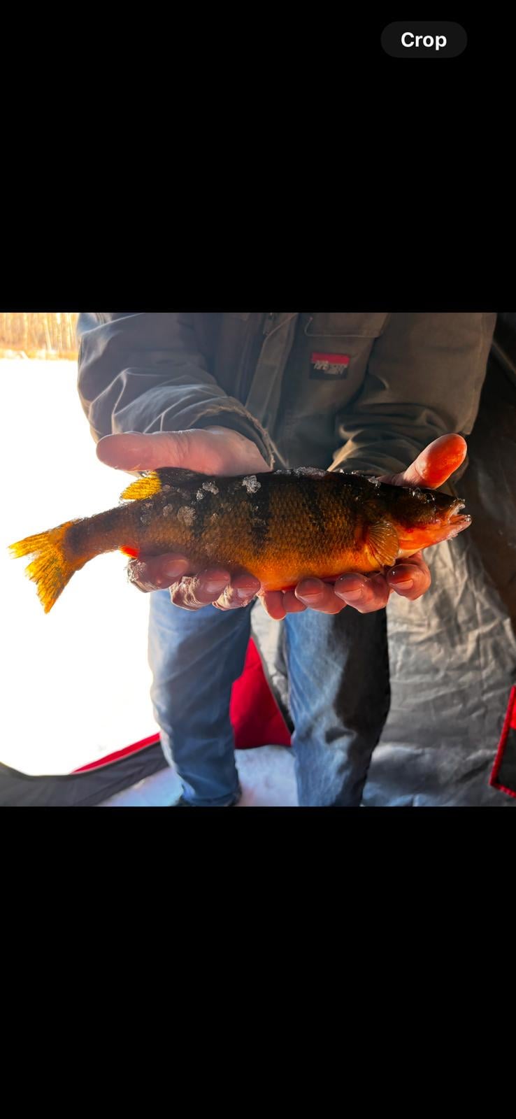 50 km/h winds tangled my line (30+ feet deep) after I caught one. Told dad to fish out of that hole while I sorted it out. Immediately pulled this guy out. And proceeded to outfish me all day afterwards. Scale battery was dead but we're guessing 1.5 lbs.