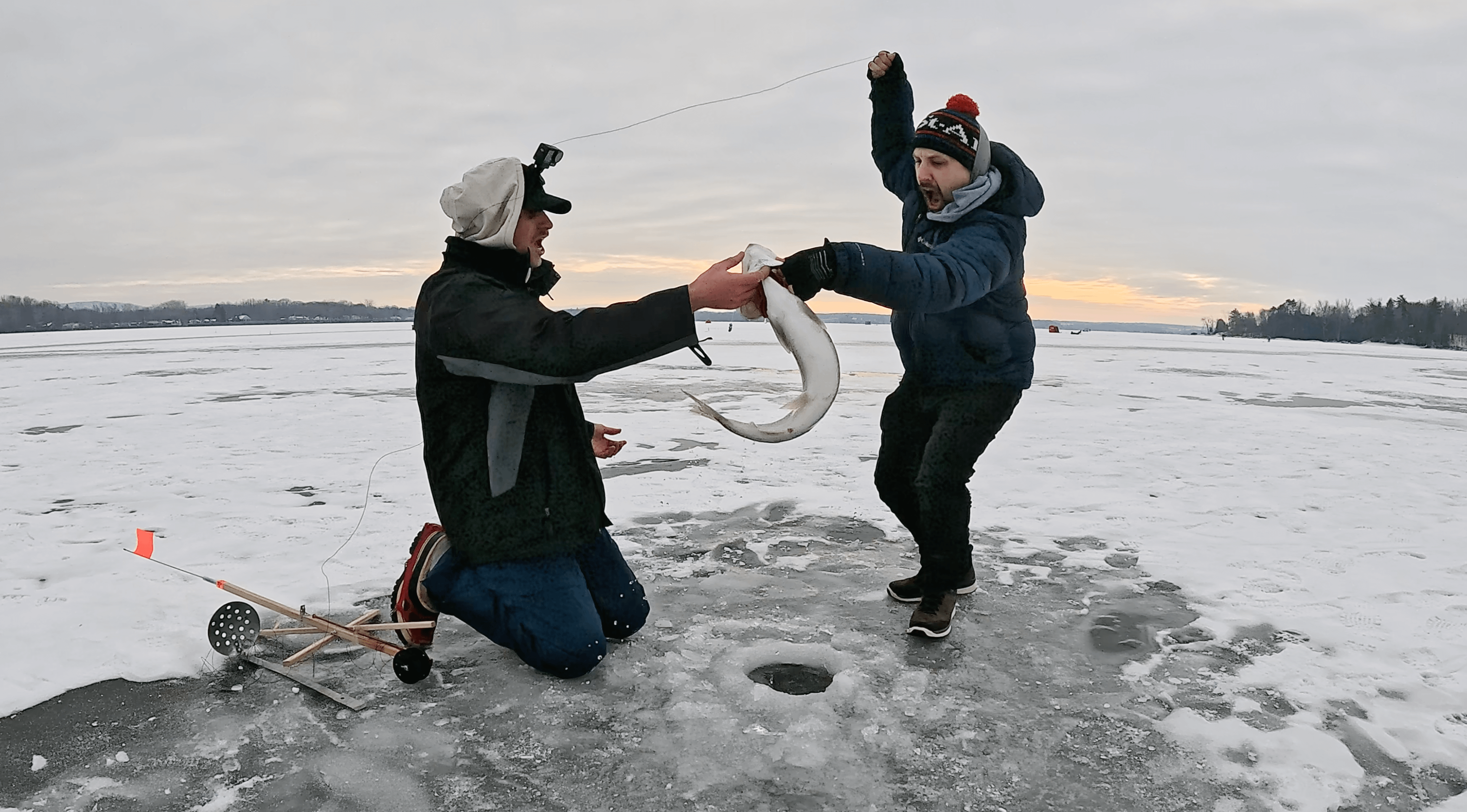 First Lake Trout on a tip-up a nice 24″ + this epic still