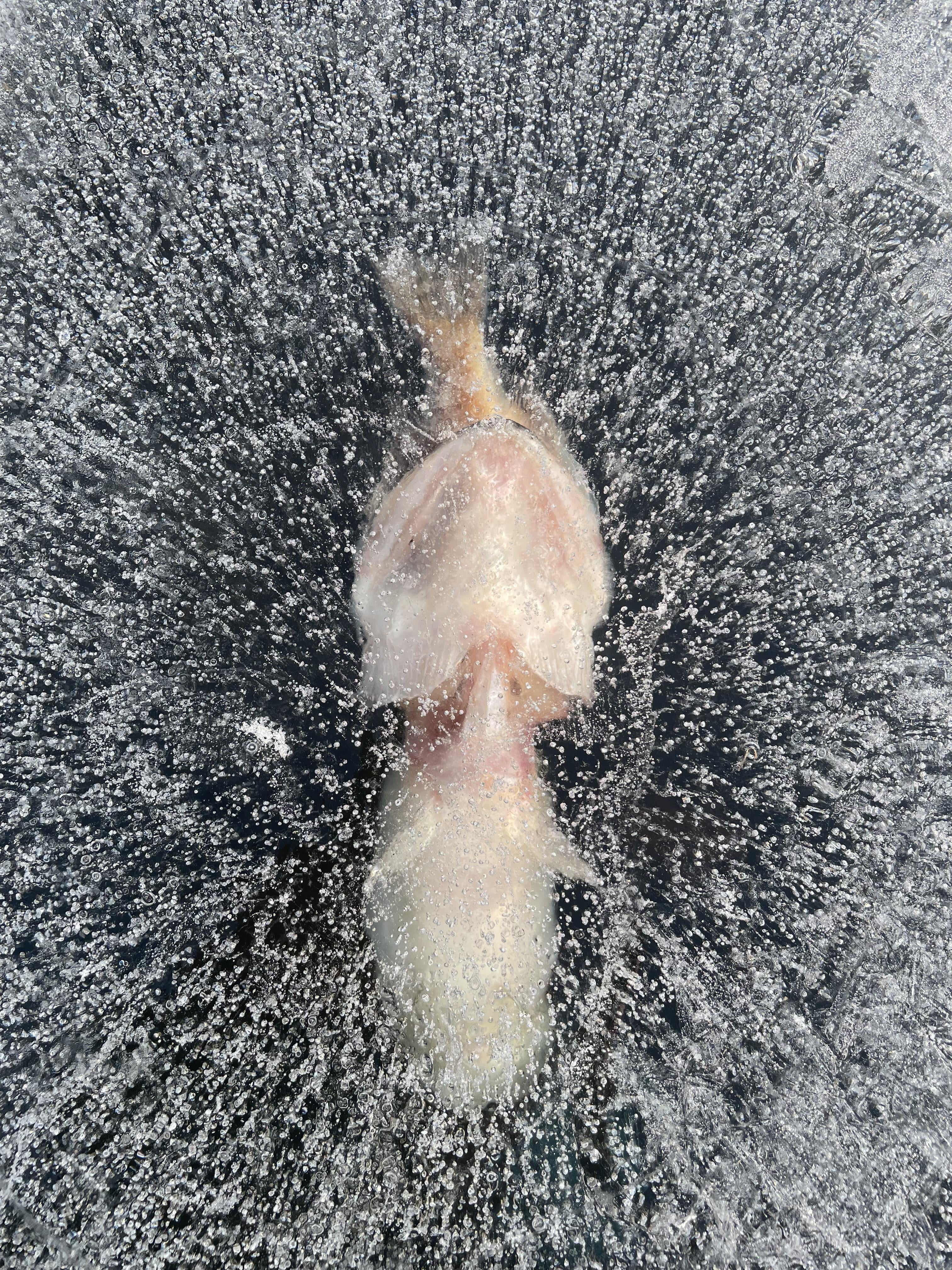 Saw this yesterday while out on the ice. Pretty wild. Big pickerel with a sunny tail sticking out of his mouth. Was about an inch under the ice. Posted by Unclegrundle
