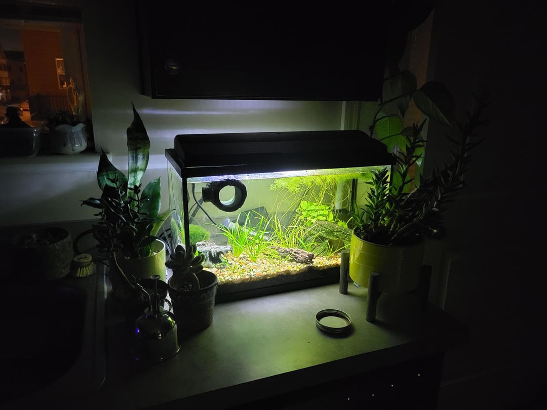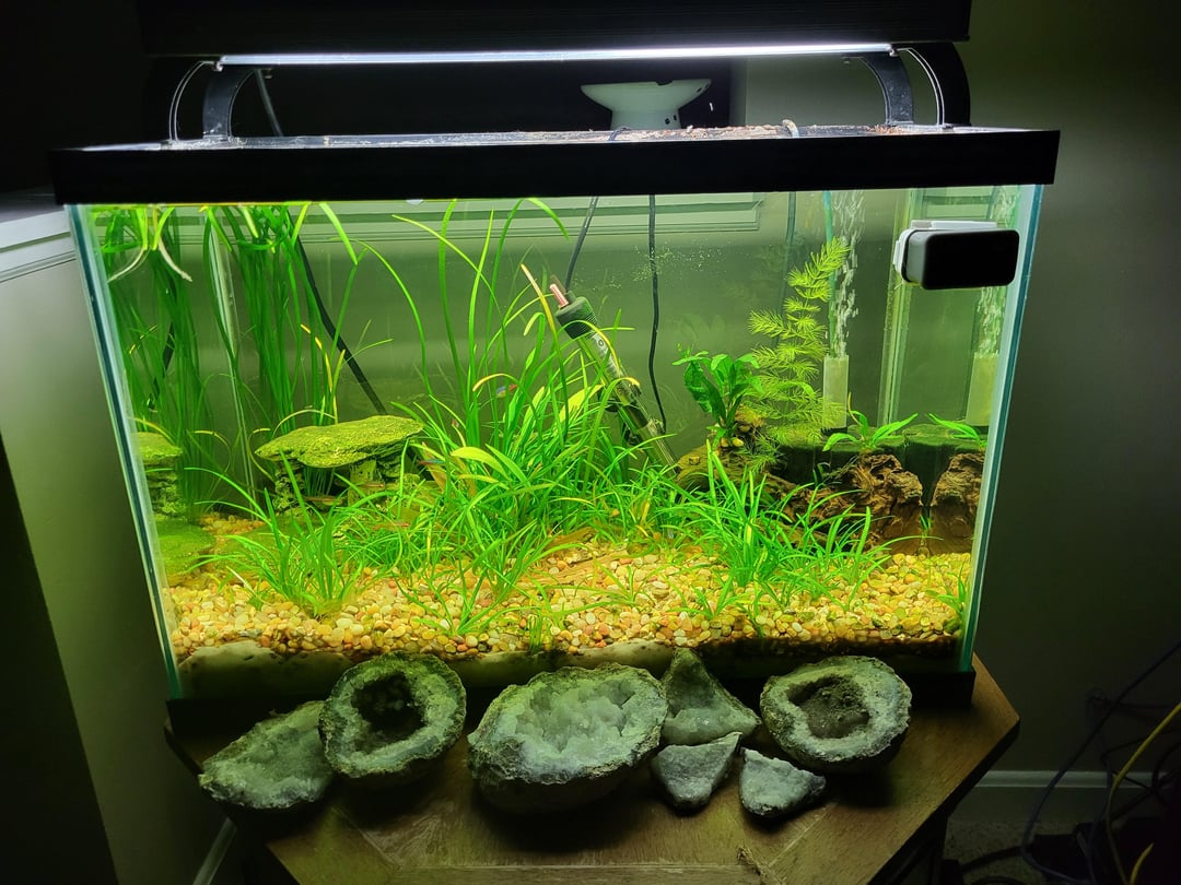 After taking picture number two, I had a huge pile of plants that somehow never made it to the trash. I tripped and fell down the stairs and all the way into the garage. In my confusion I accidentally grabbed a tank, lid, lights, sand, a heater, sponge filter and airline.