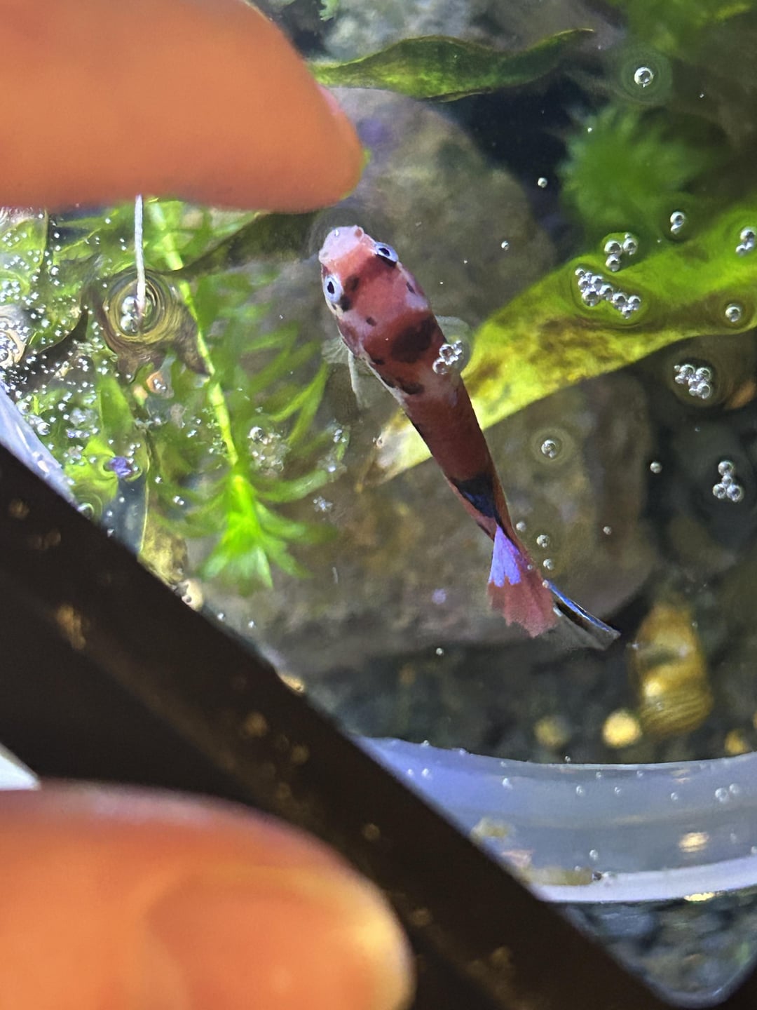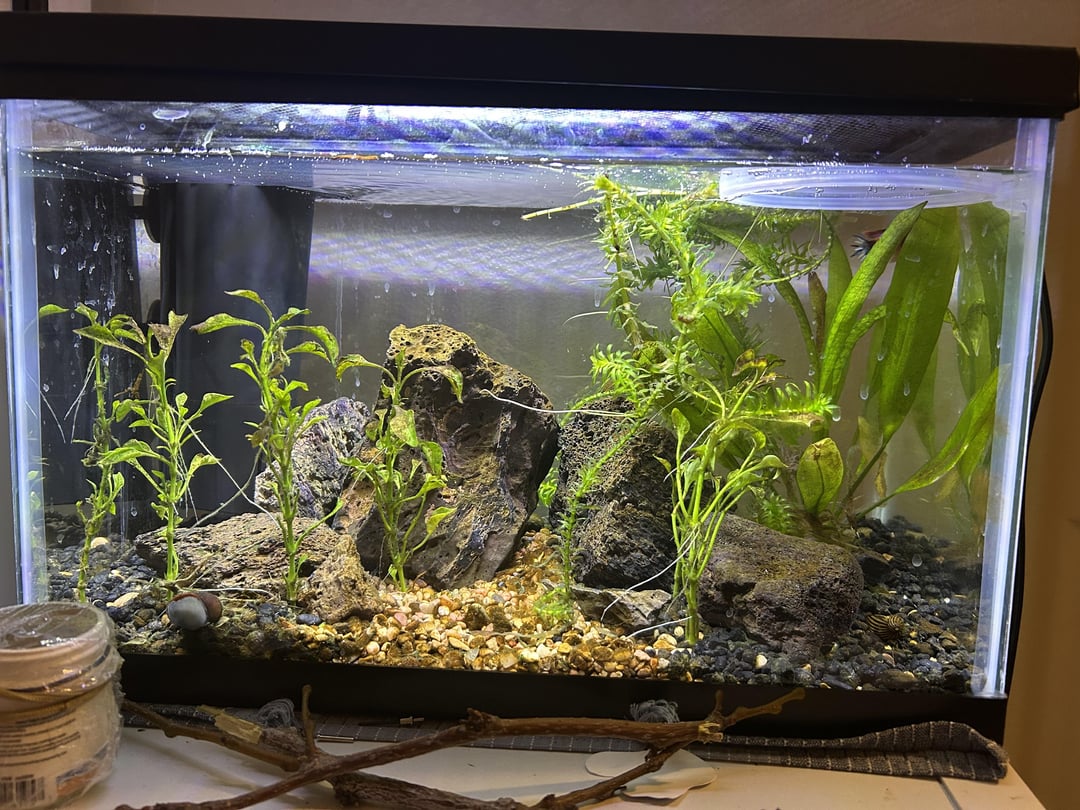 This tank has been established for about 6 weeks. It was cycled with established substrate, water and filter medium. I have an amazon sword, some anacharis that is going through some plant melt, and some sort of ludwigia. I dose easy green for fertilizer. Its a 5.5 gallon tank with a modified 10 gallon tetra whisper filter.