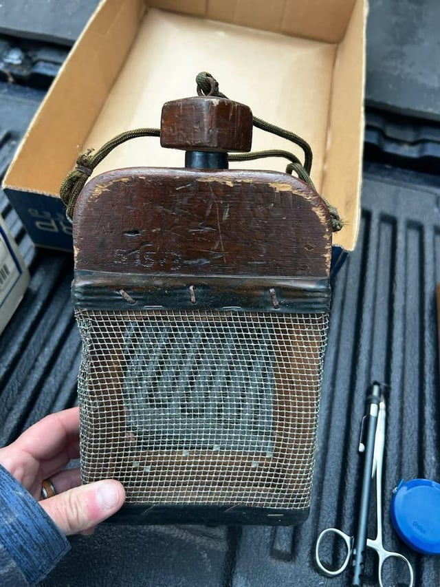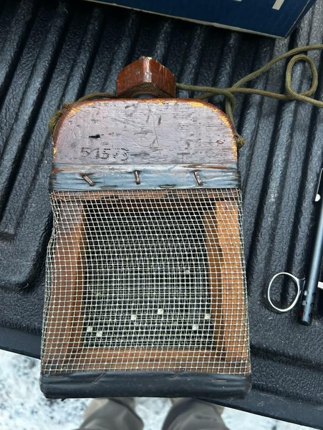 A TU buddy just got this donated for the TU auction. Any idea what it is? Definitely looks homemade but all I can think is maybe a bait container for hellgramites or crayfish that drags behind you???