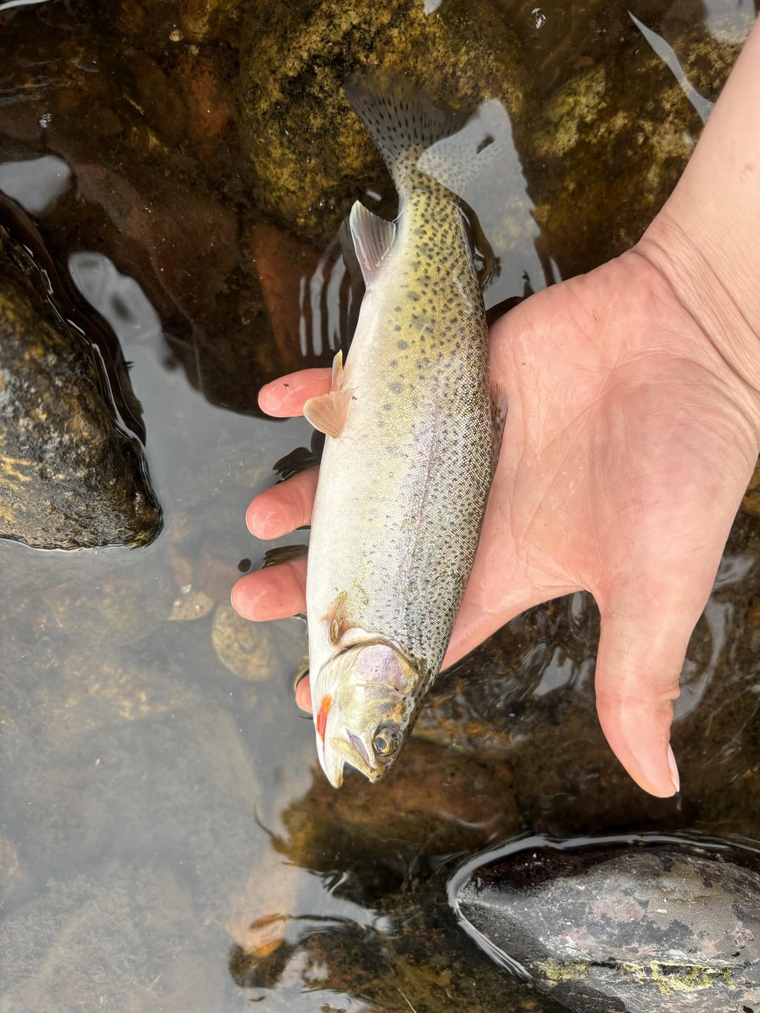 Size 22 grey RS2 with flash trailed by a 22 bling midge. Maybe a smaller yellow stimulator or foam terrestrial or large adams fly on top. Small bit of weight on the subsurface tippet knot. Looks like 6 or 7x water.