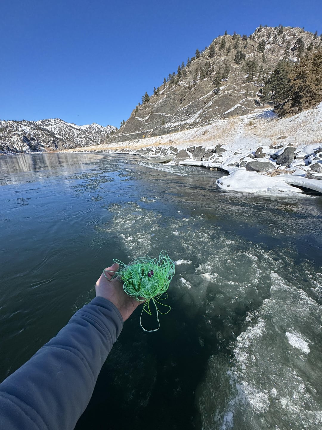 First fly fishing trip of the year here in Montana. 25° so I was fighting ice all day, ice in the river, ice in the eyelets, and must destructively; ice in my reel. My cheap rafting fly rod (Orvis encounter) has on fatal flaw. If ice builds up in the reel, the quick release WILL disengage and drop half the reel in the river.