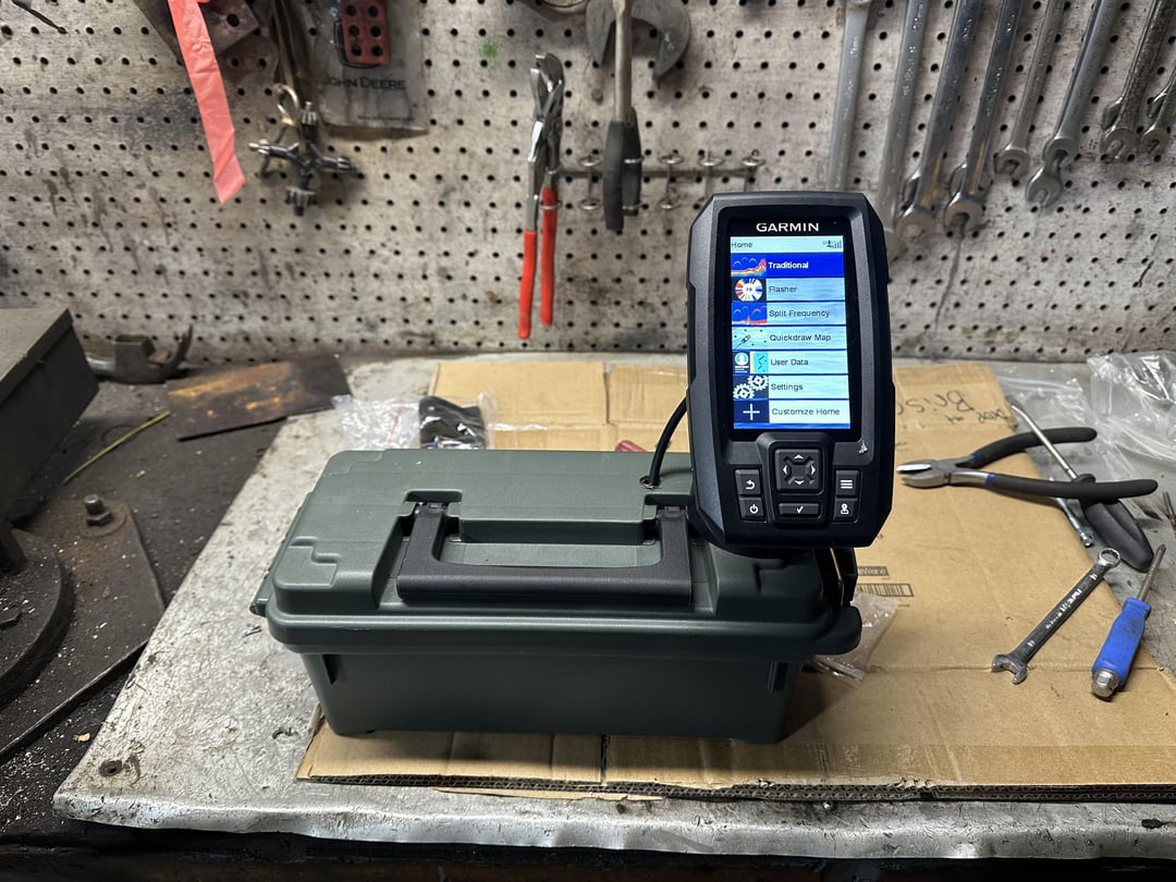 Got myself a Garmin striker 4 CV, built my own portable kit. Cheap ammo box and 10Ah Battery were the only expenses for the portable kit, broken hockey stick worked perfect for the transducer! Posted by greenbee432