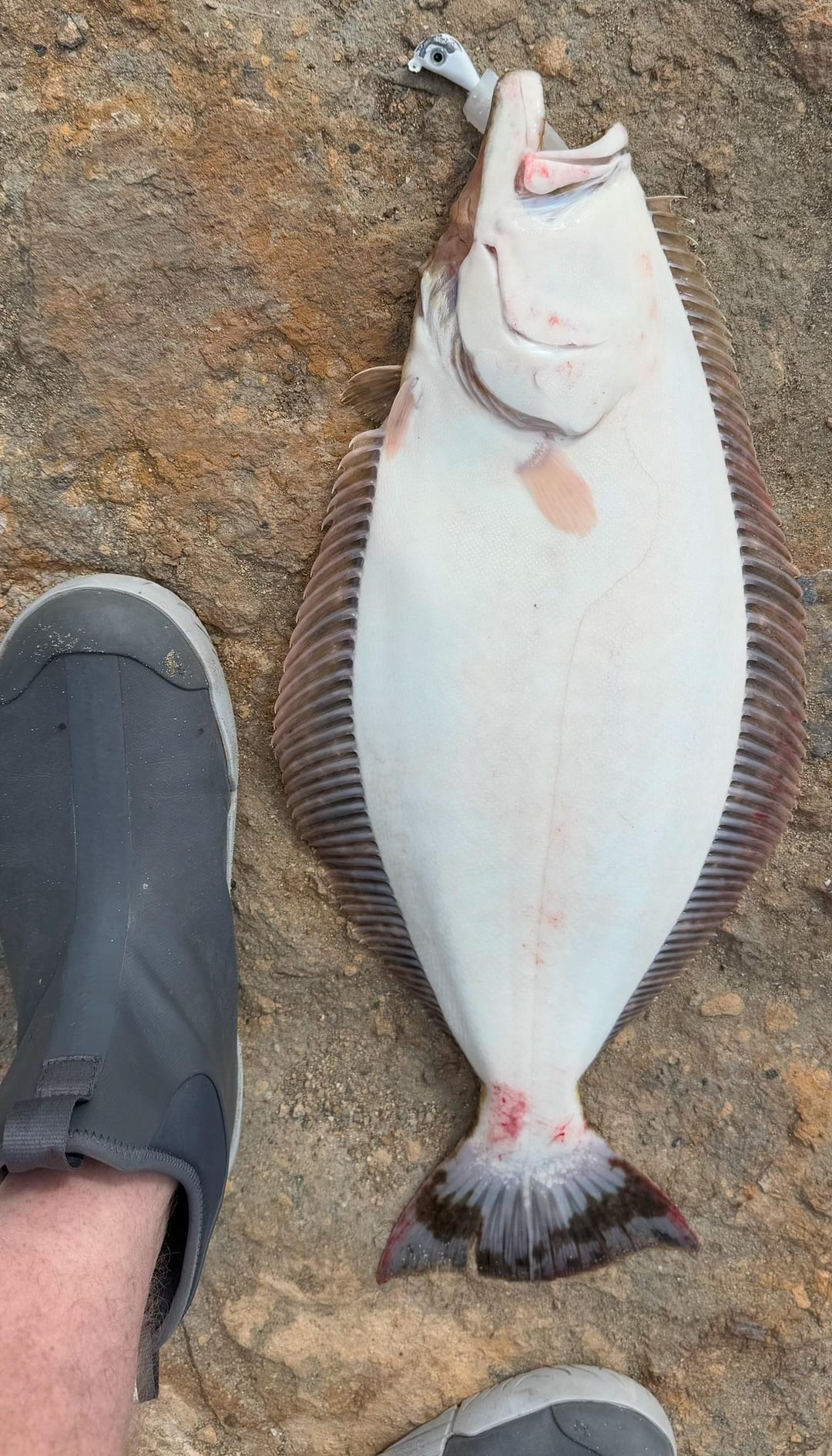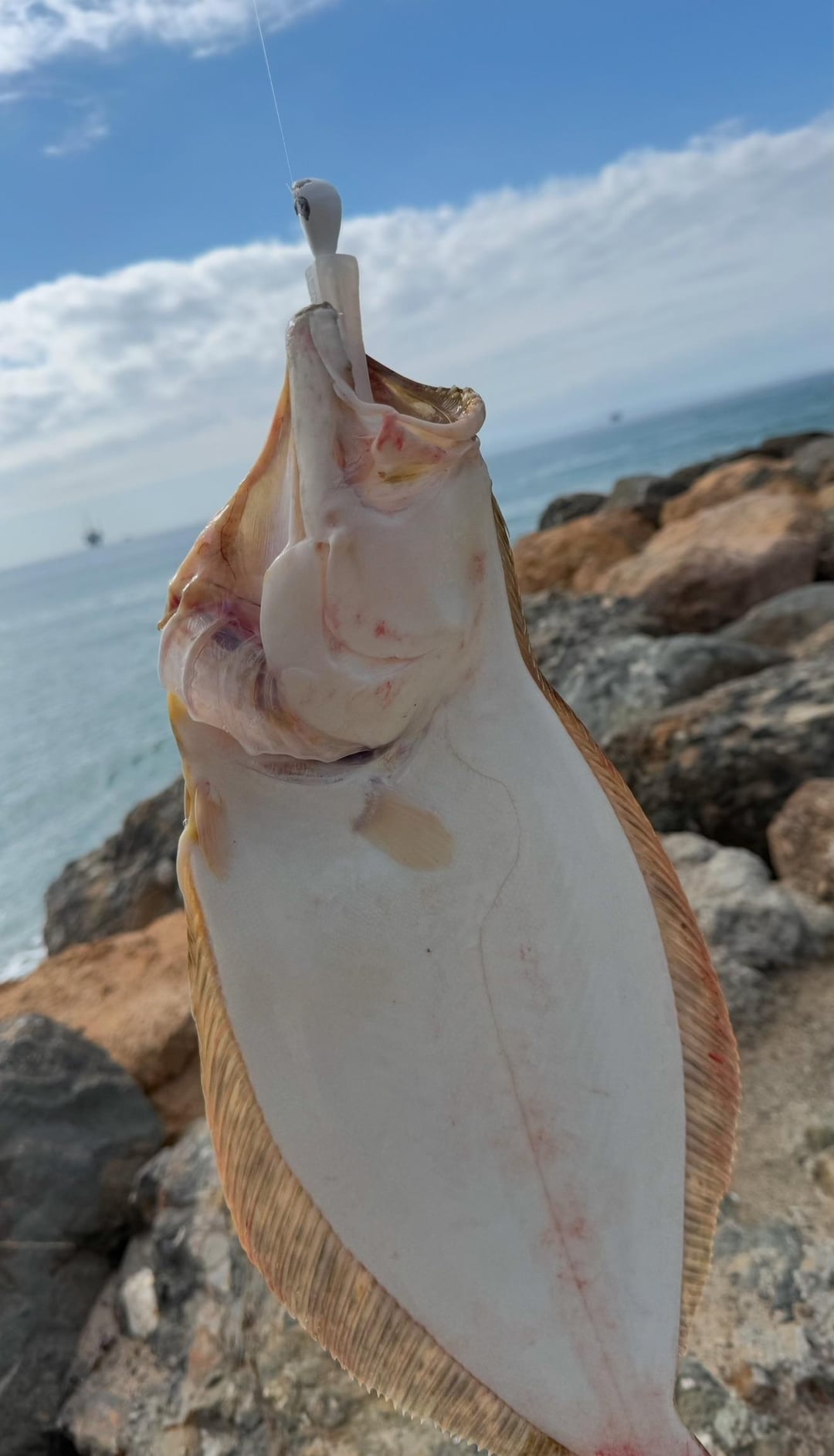Had an hour to throw today between meetings and caught this nice legal +2” flattie today at Bolsa Chica on a 2oz white leadhead with a 5” Big Hammer pearl swim bait.