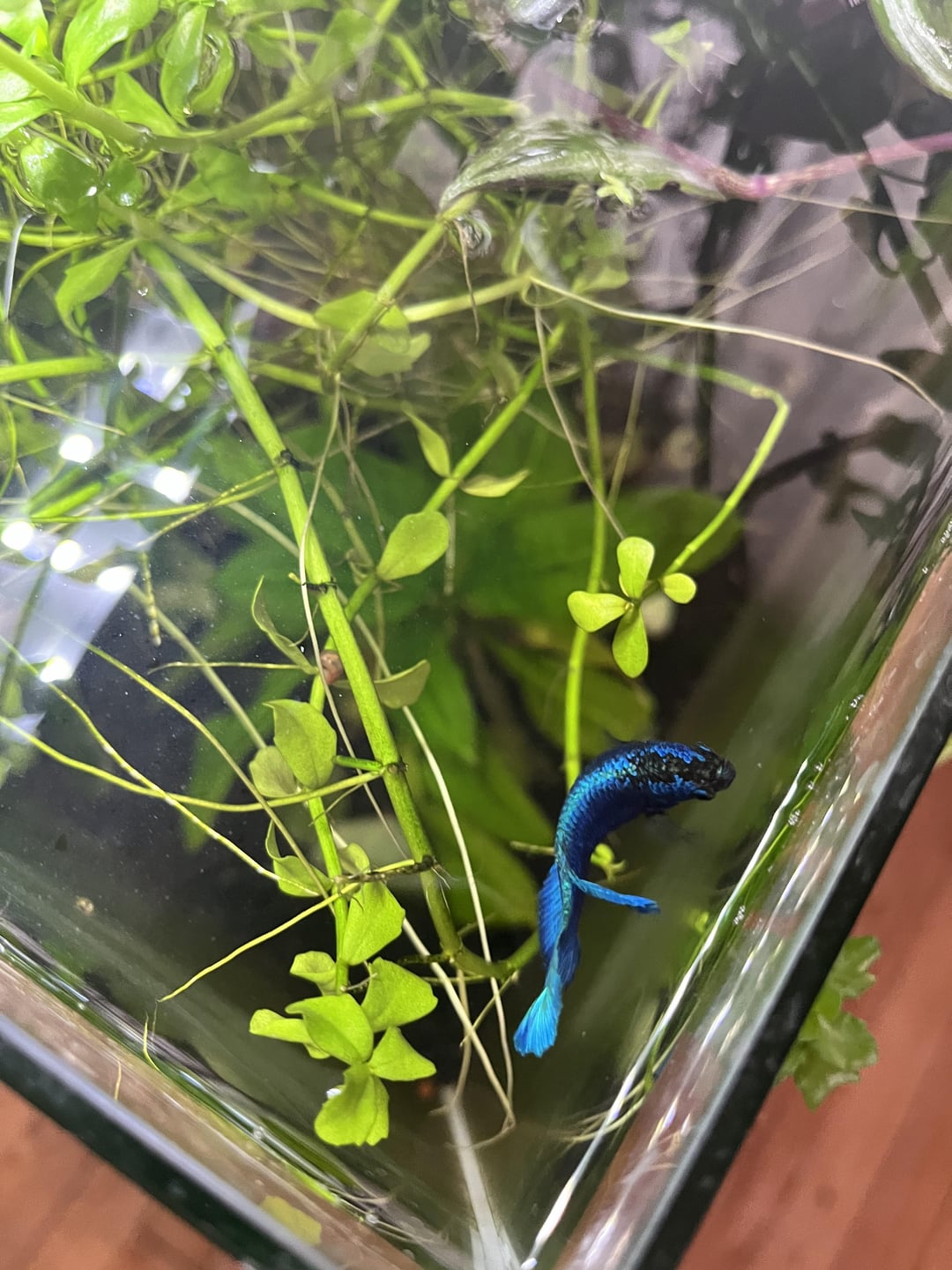 I was at Petland (I know, I know) and saw this gal dying in a cup. I wish I had taken some before pictures bc her glow-up is amazing. She was gray with just a hint of teal, prominent stress stripes. She would hold still for pictures, but she’s a beauty.
