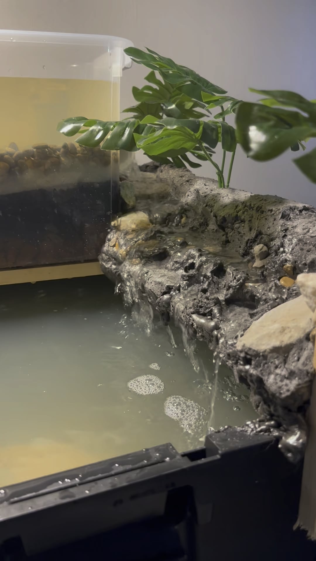 Used the Kraken brand waterfall foam sealer, first attempt. Never used this stuff before so I wanted to see how it would behave for a monitor paludarium I’ve got planned. Decided I’d build a cheap 40 gal breeder and attempt to make a waterfall/creek. I think it turned out okay, definitely glad I decided to do a little experimenting because this stuff is kind of a pain in the ass to work with. But it’s worth it I feel. Now I’m going to drain the tank and do some detail work on the waterfall (mosses, sticks, rocks). Once I have the details wrapped up I’m going to use the foam once more to create a planter on top of the filter (clear tote) for my monstera and pothos propagation