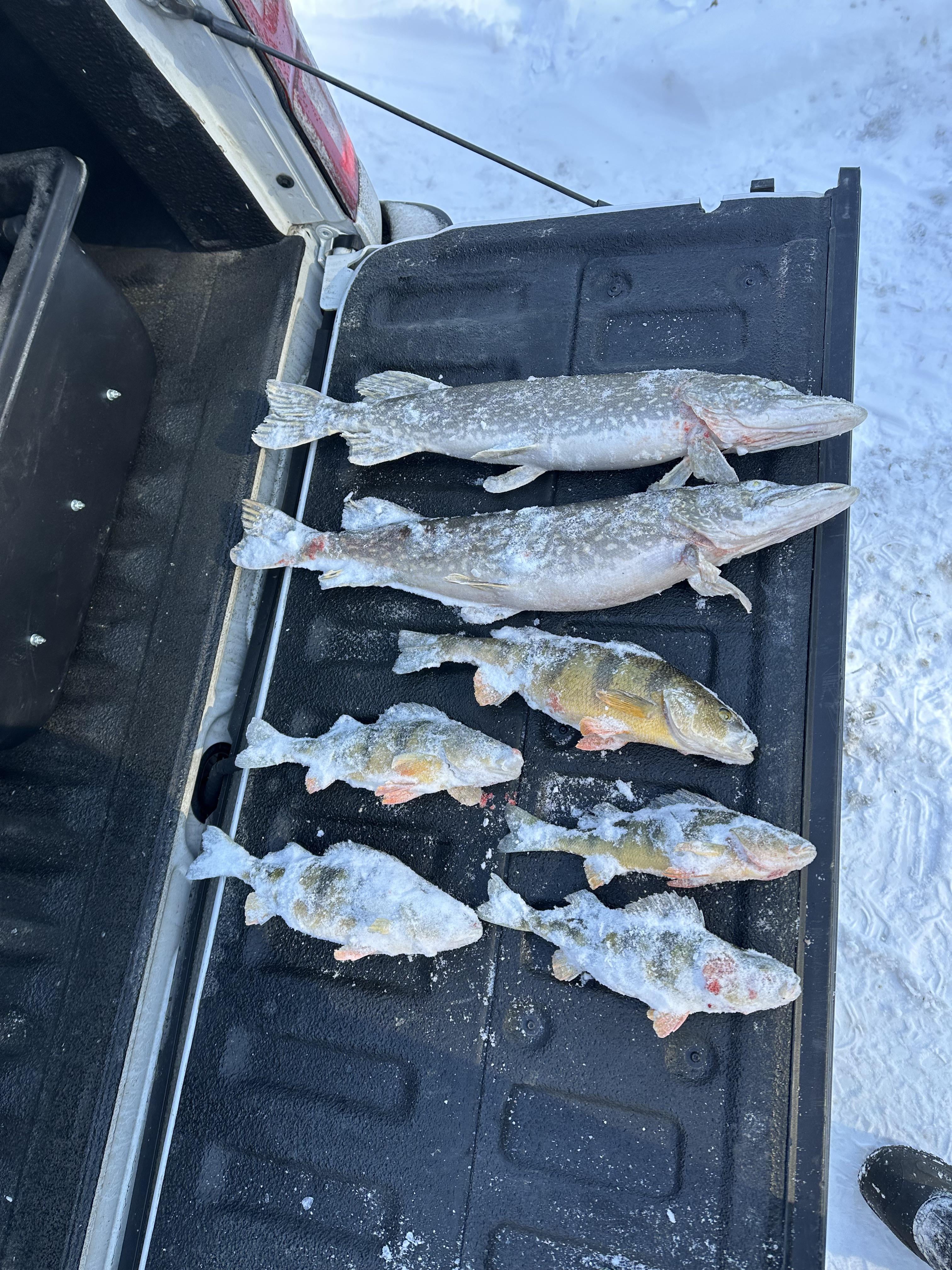 Met my cousin from NH in eastern VT halfway between our houses. Not the most monstrous northerns or yellows bjt we had a lot of fun catching up and not having hardly any success on the ice this or last season made today a great outing. My 5yo son loves fried fish and was equally excited even though he didn’t come this time.