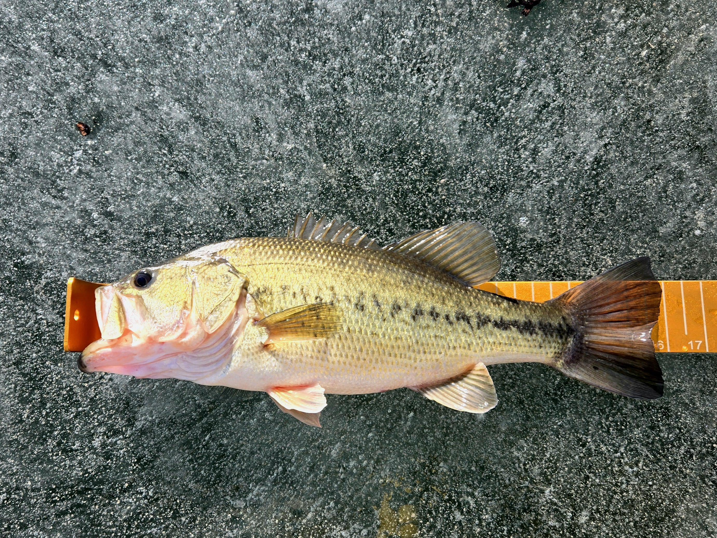 I was at the same little 14 acre local lake I frequent multiple times a week. The bite was slow, but that's typical. A few bass in between the fry-size sunfish to keep me motivated. The weather was beautiful. 50⁰ and sunny on 8" of waning ice. The edges are getting soft and open water is visible in places.